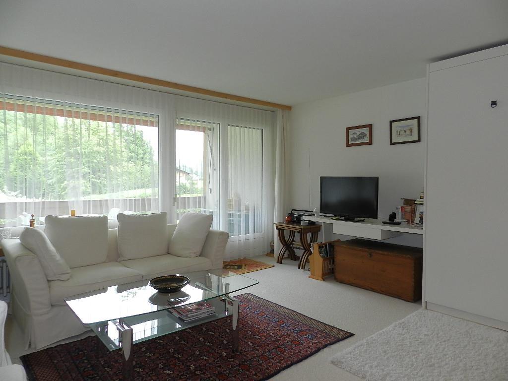 2-Zimmerwohnung (75m2) im 1. Stock eines Appartementhauses in Gstaad. Ruhige und sonnige Lage in unmittelbarer Nähe der Gondelbahn Eggli. Ca. 10 Gehminuten vom autofreien Dorfzentrum und Einkaufsmöglichkeiten entfernt. Bushaltestelle (nur Winter) vor dem Haus. Waschküche mit Waschmaschine und Wäschetrockner sowie Parkplatz stehen zur Verfügung.