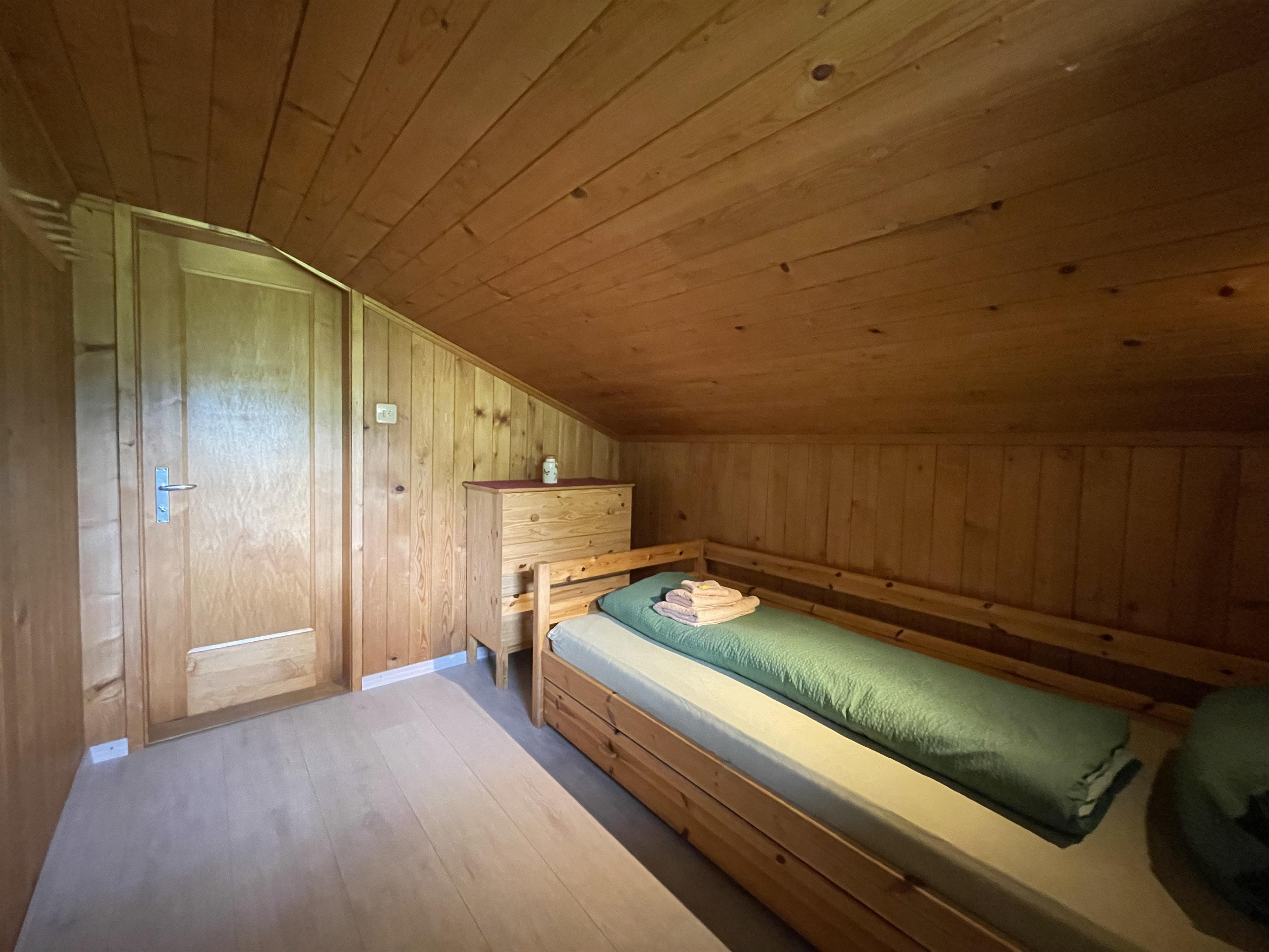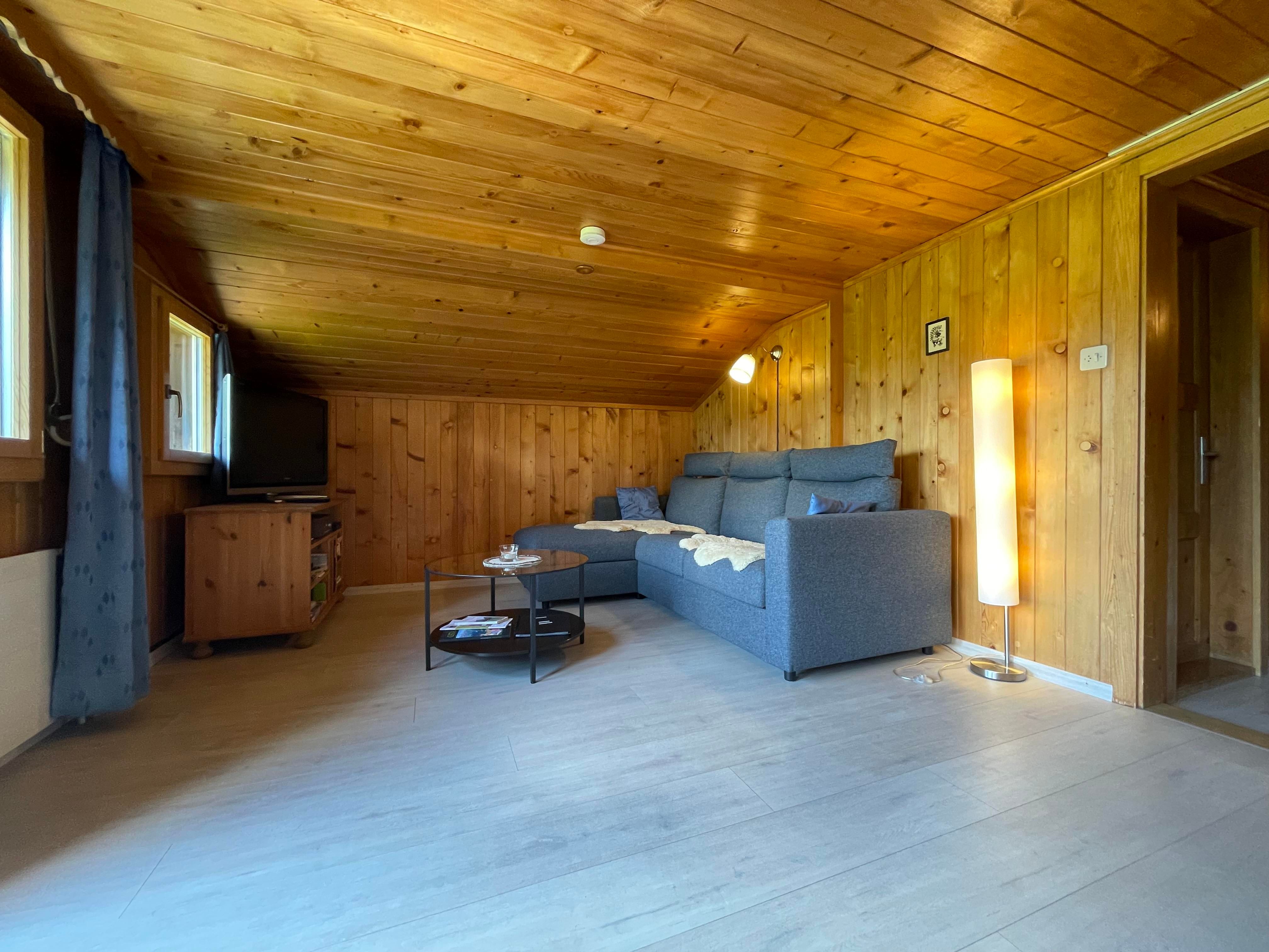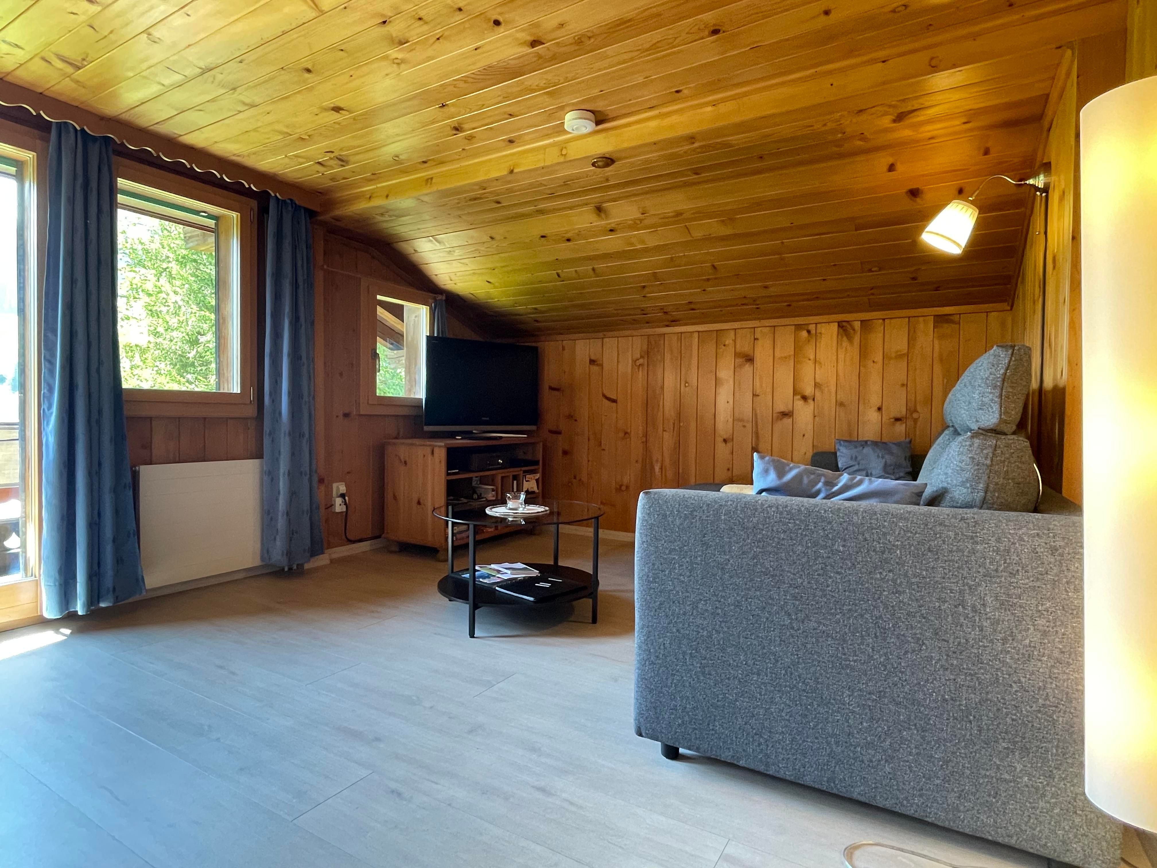 Gemütliche 4 1/2-Zimmer-Dachwohnung mit teilweiser Dachschräge. Raumhöhe 2.00 Meter ausserhalb Dachschräge. 1 Schlafzimmer mit Doppelbett (2x90x200cm) und Kleiderschrank. 1 Schlafzimmer mit zwei Einzelbetten (90x200cm), offene Garderobe und Kommode. 1 kleines Zimmer mit 1 Bett (90x190cm) und Kommode. Bad/WC. Separate Küche u.a. ausgestattet mit Backofen, Geschirrspüler, Kapsel-Kaffeemaschine (Delizio), Fondue- und Raclette-Set. Wohnzimmer mit Esstisch, Sofa, TV/Radio und DVD Blu-ray. WiFi.