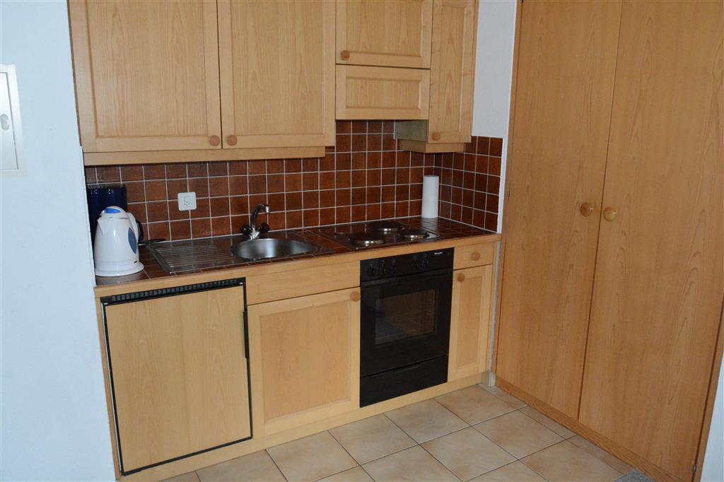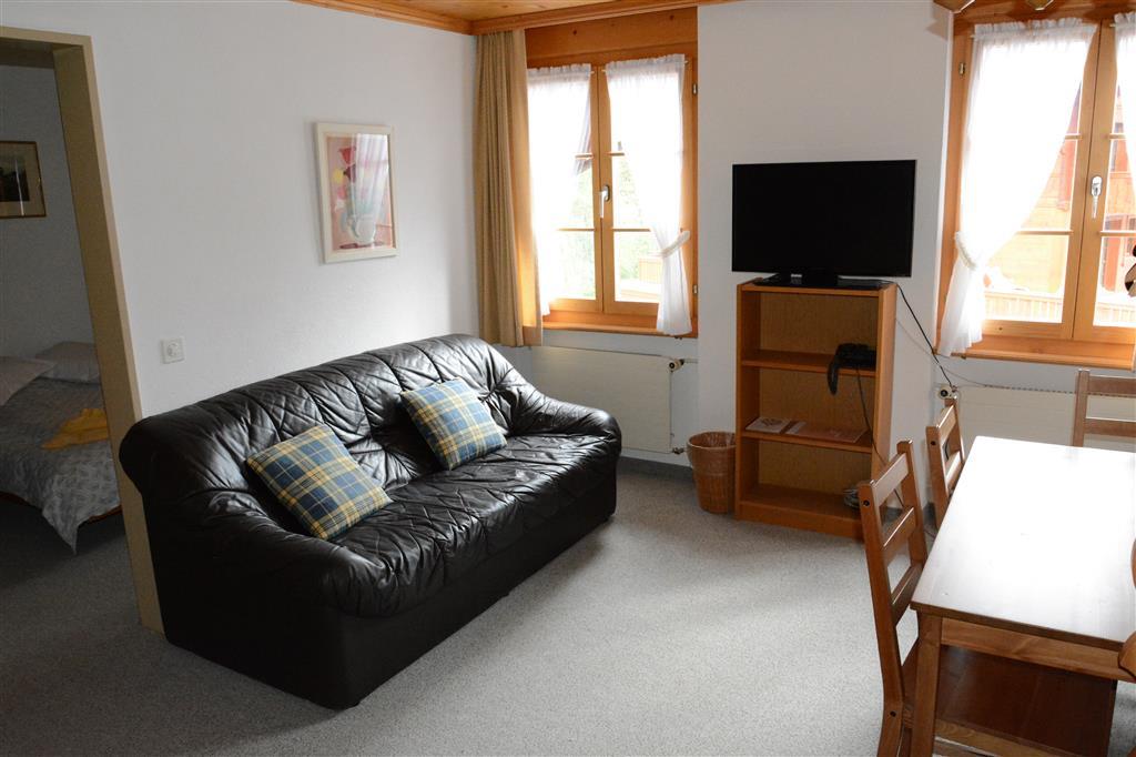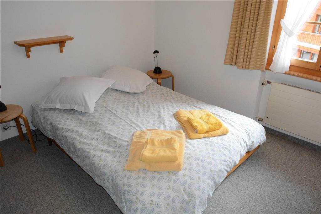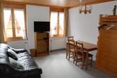 Esszimmer mit Tisch und Polstergruppe. Offene Küche u.a. ausgestattet mit Filter-Kaffeemaschine, Fondue- und Raclette-Set.1 Doppelschlafzimmer (180x200cm) mit Schrank. Dusche/WC. Kabel-TV/Radio. Ausblick Richtung Nord-Ost. WiFi.