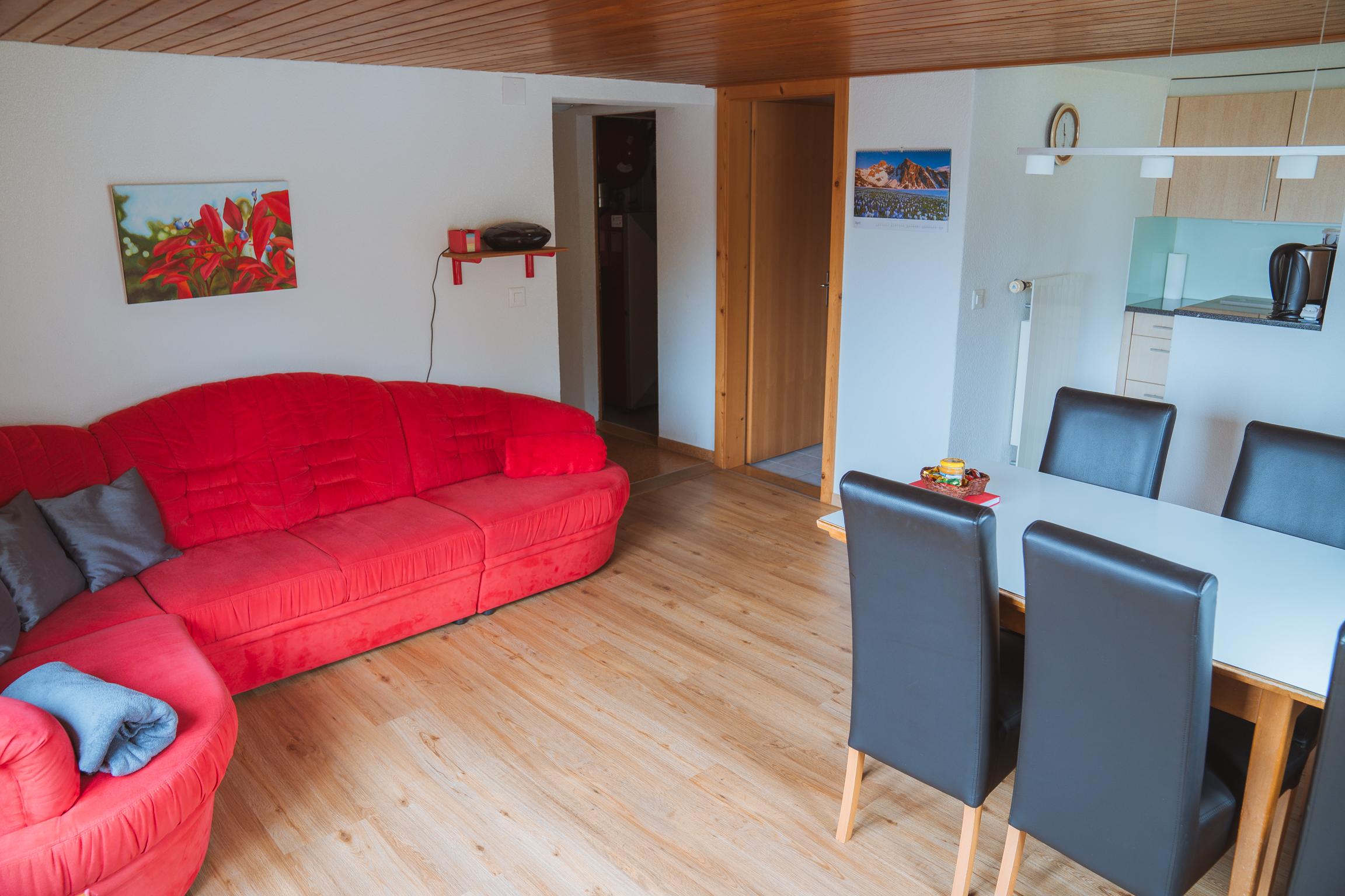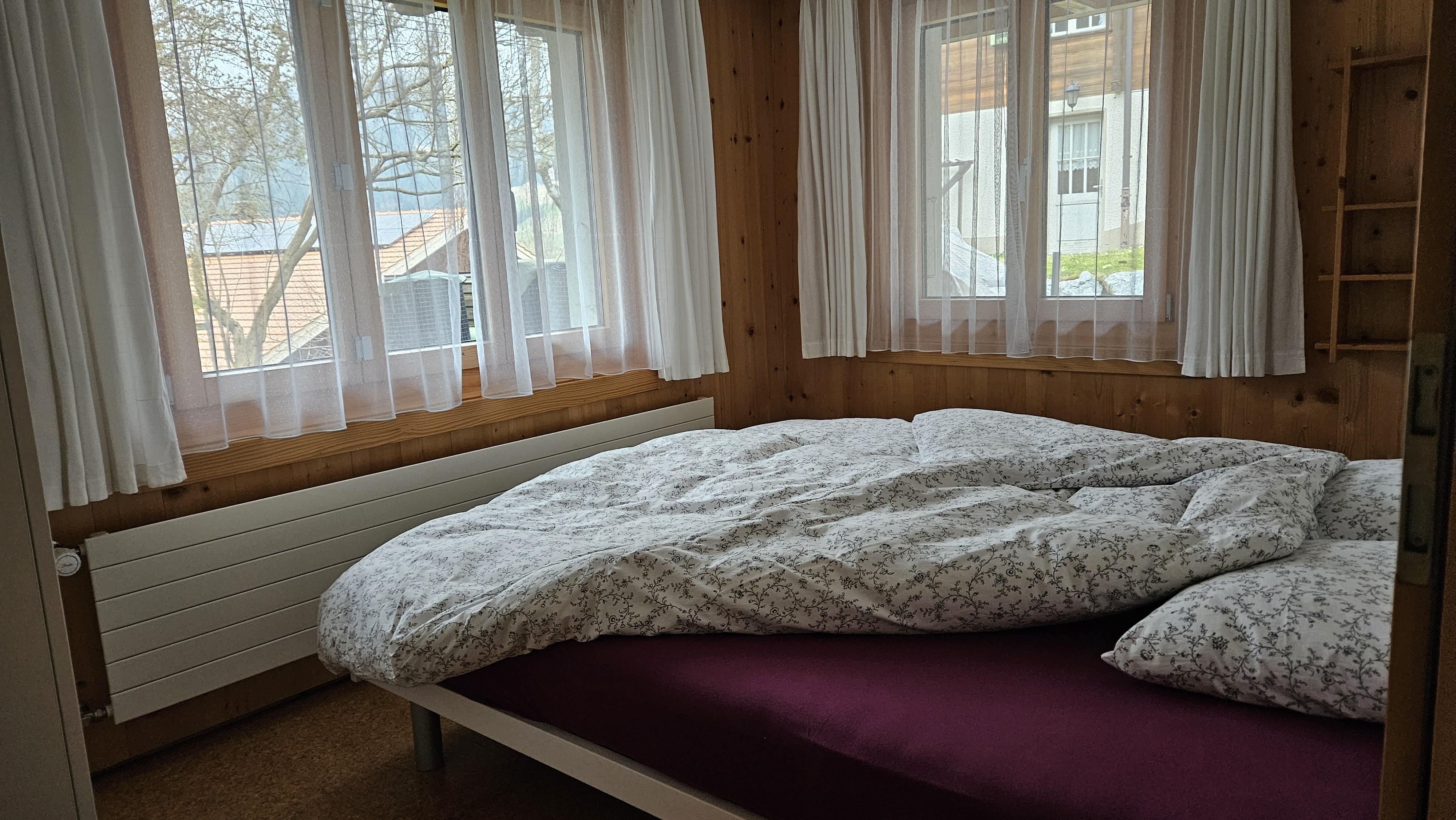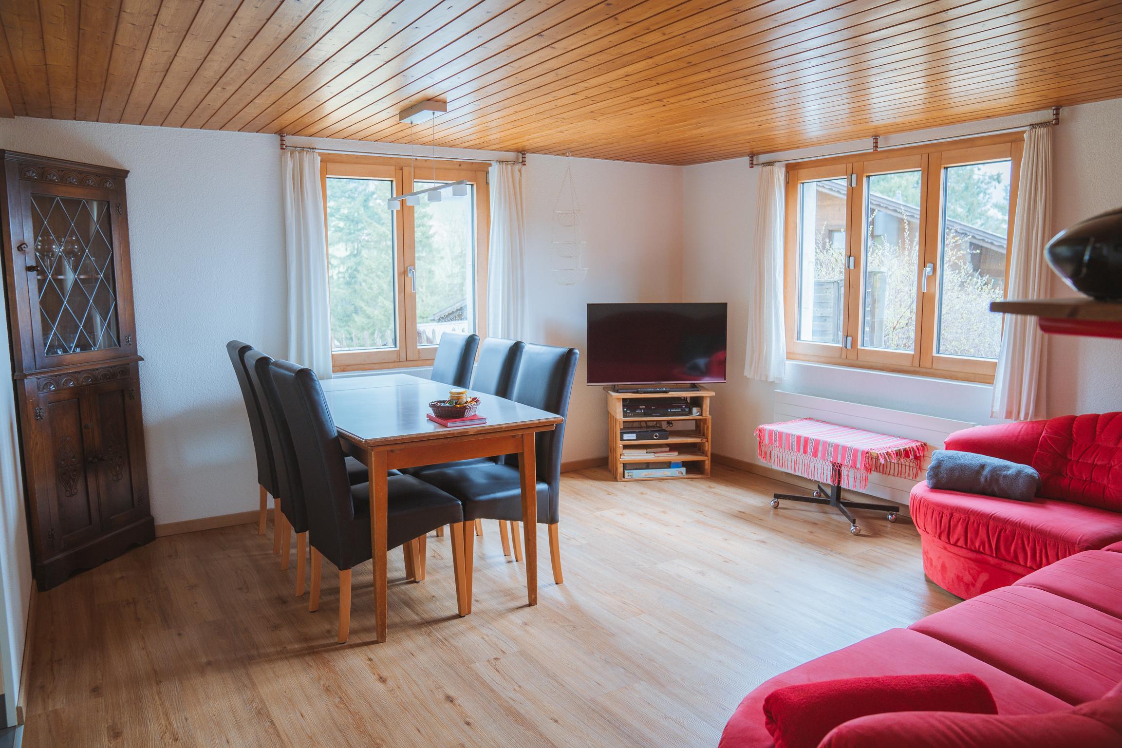 4-Zimmerwohnung (70m2) im Tiefparterre eines 1970 erbauten 2-Familienhauses. Ruhige Lage mit schöner Aussicht. Nahe Tennisplatz, Wald, Wanderwegen, Schwimmbad und Skipiste Rinderberg. Waschmaschine und Trockner in der Liegenschaft zur gemeinschaftlichen Nutzung vorhanden. Aussensitzplatz und Liegewiese vorhanden. 700m bis ins Dorfzentrum. 2 ungedeckte Parkplätze stehen zur Verfügung.
