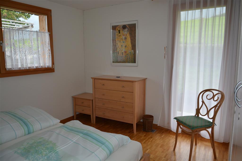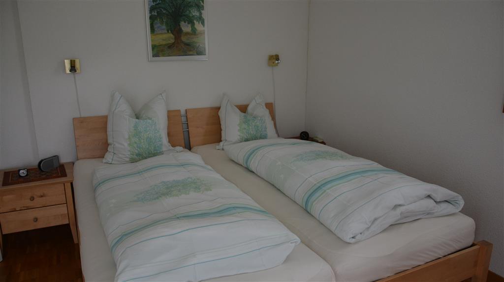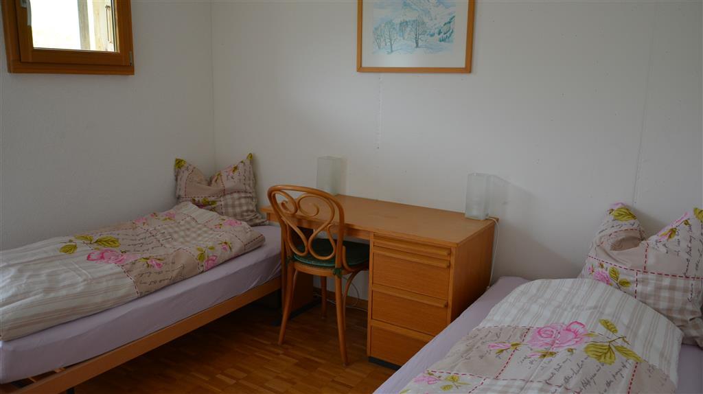 Grosses Wohnzimmer mit integrierter Küche, Geschirrspüler, Kühlschrank mit Gefrierfach, Kapsel-Kaffeemaschine (Delizio) sowie ein Fondue- und Raclette-Set. Cheminéeofen, TV/Radio, Telefon und WiFi. 1 Badezimmer mit WC, Lavabo, Dusche und Waschmaschine. 1 Schlafzimmer mit 1 Doppelbett (2x90x200cm). 1 Schlafzimmer mit 2 Einzelbetten (2x90x190cm). Kinderbett (60x120cm) inkl. Bettwäsche vorhanden. Zusätzlich auf Anfrage 2 Klappbetten für Kinder möglich.