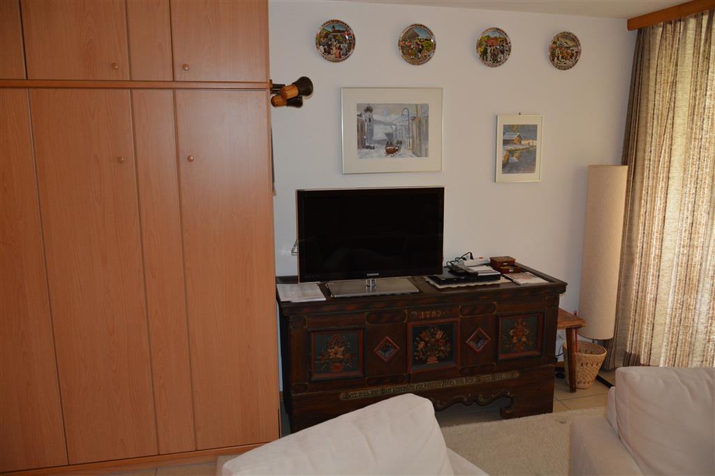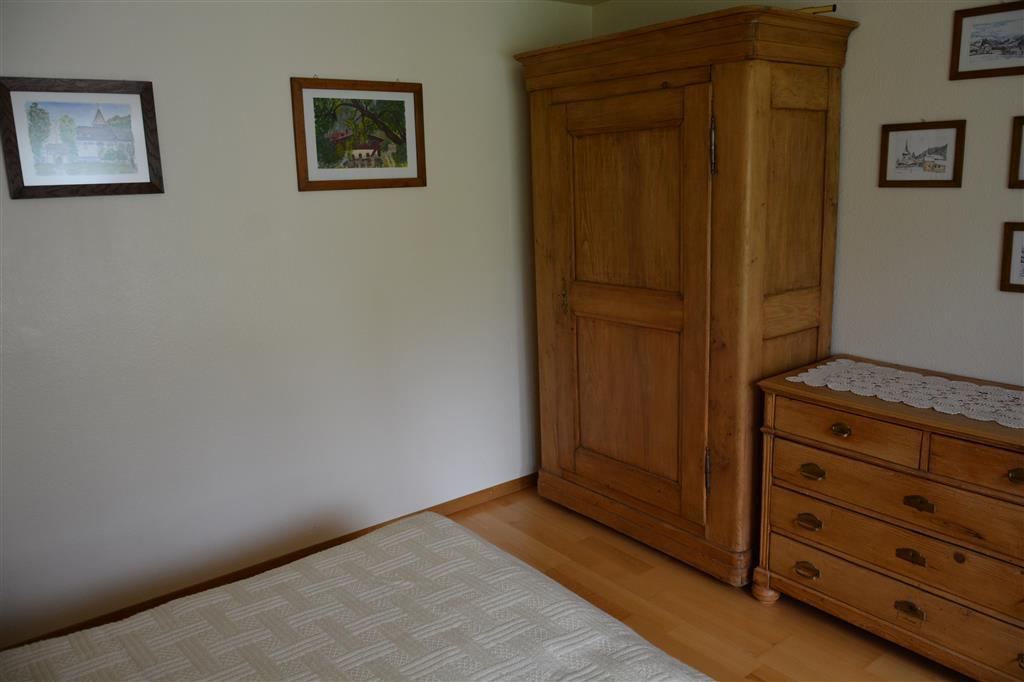 2-Zimmerwohnung. Wohn-/Esszimmer mit Wandschrankbett (2x85x195cm). 1 Schlafzimmer mit 2 zusammengeschobenen Einzelbetten (2x90x200cm). Kleine separate Küche u.a. ausgestattet mit Kapsel-Kaffeemaschine (Nespresso) sowie mit Fondue- und Raclette-Set. Badezimmer mit Badewanne und WC. WiFi.