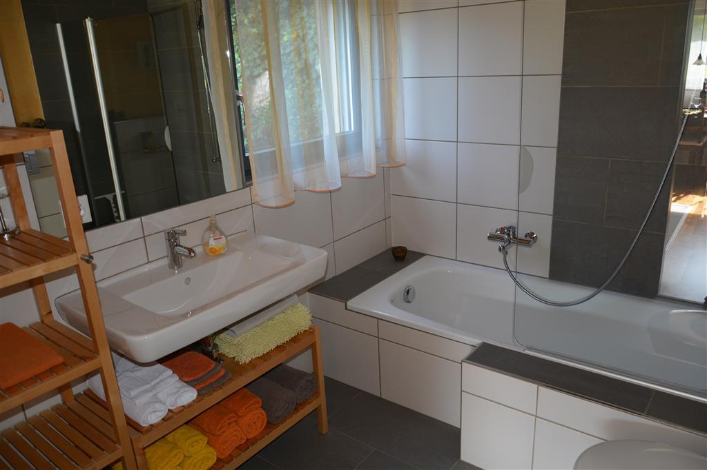 Badezimmer: Kombinierte Dusche und Badewanne.