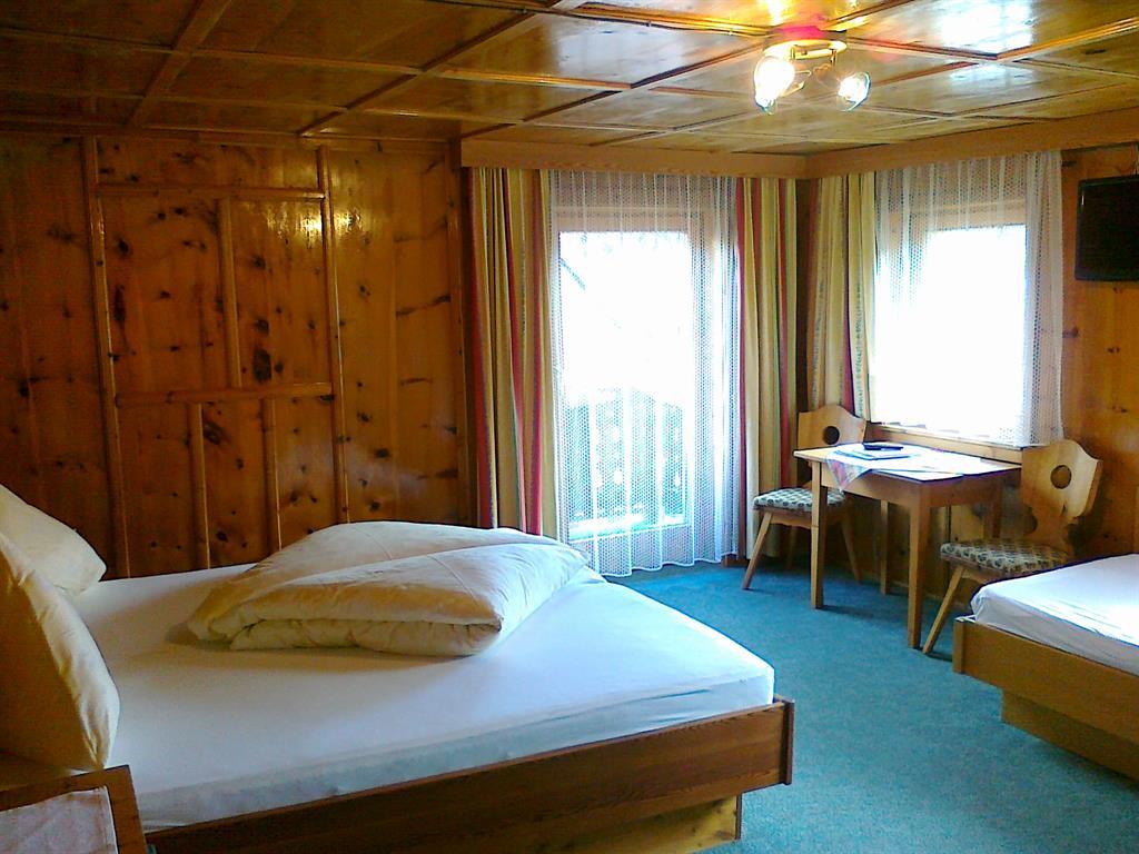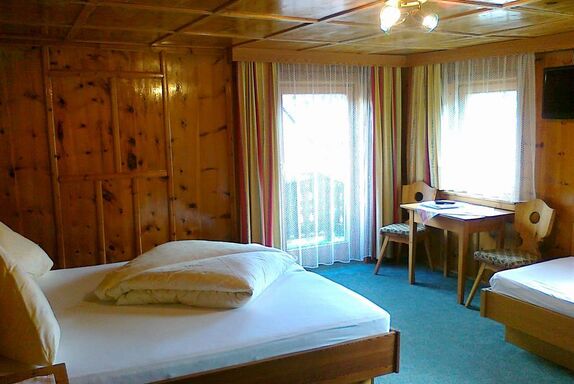 Rustika, gemütlich, eingebautes Dreibettzimmer mit Doppelbett und Einzelbett, Dusche/WC, Sat-TV, Safe und Balkon. Größe: ca. 25 m².