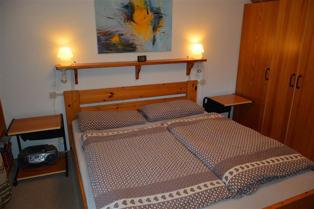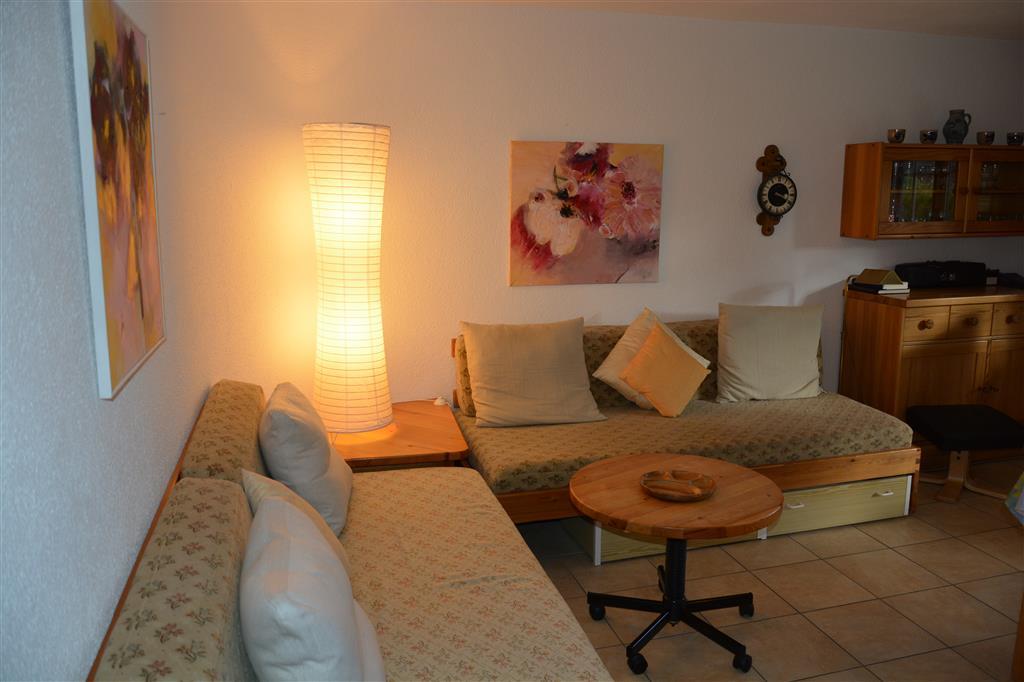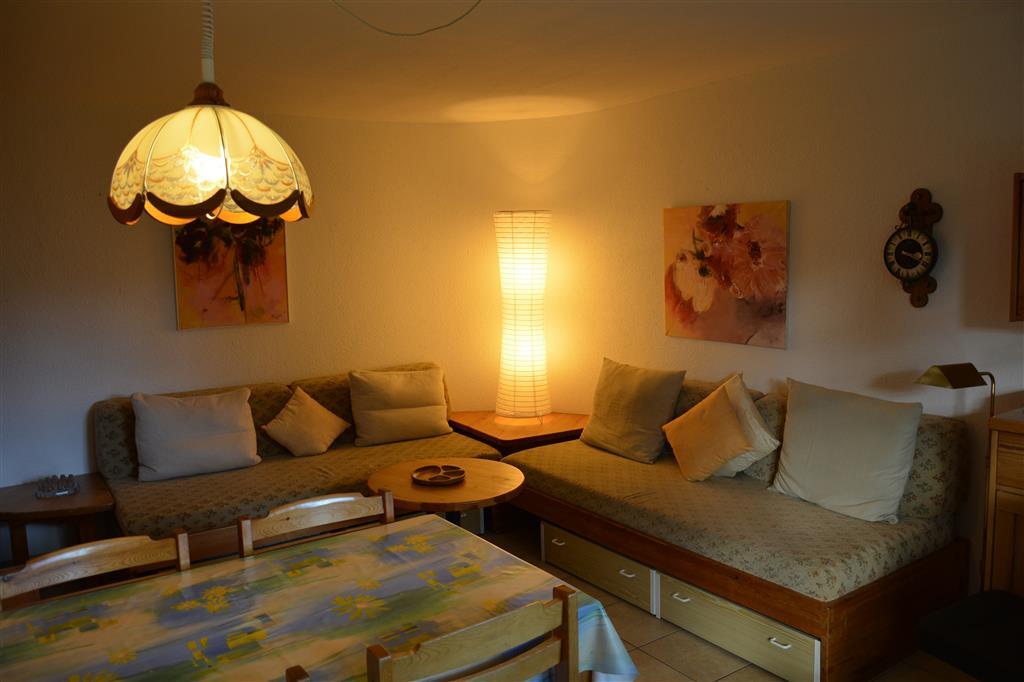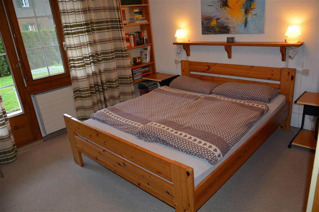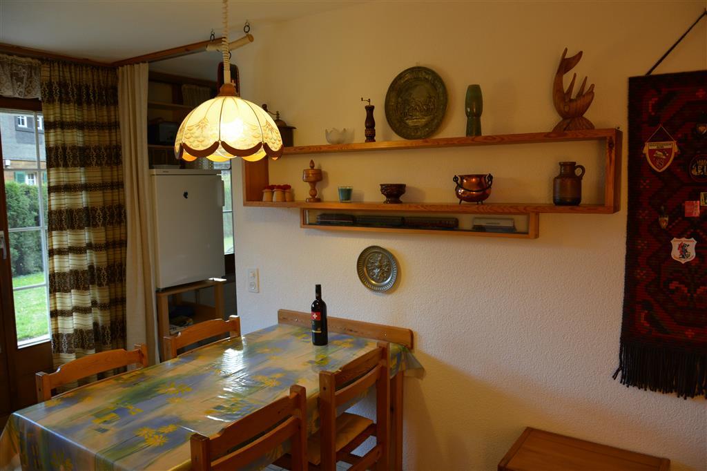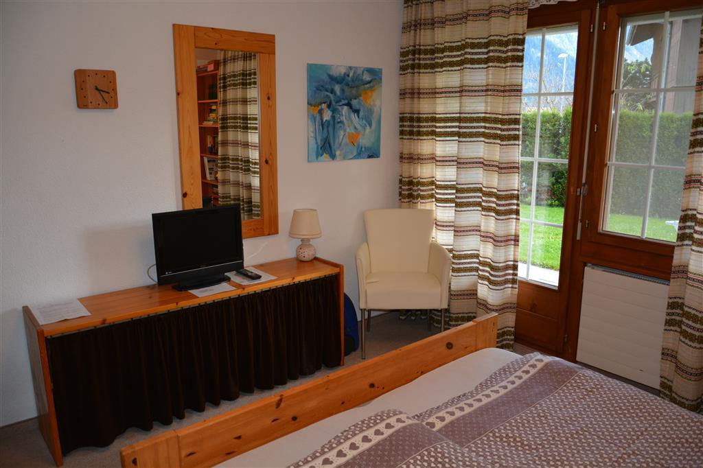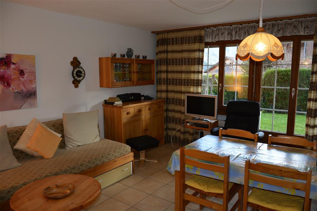 Schlafzimmer mit 1 Doppelbett (180x200cm) und 2 Kleiderschränke. Badezimmer mit Dusche/WC, Lavabo. Wohnzimmer mit Tisch und 4 Stühlen, 2 Bett-Sofas (90x200cm) und (90x190cm), WiFi. Offene Küche mit 3 Herdplatten, Backofen, Kaffeemaschine und Fondue-Set.