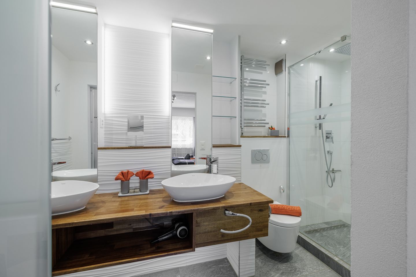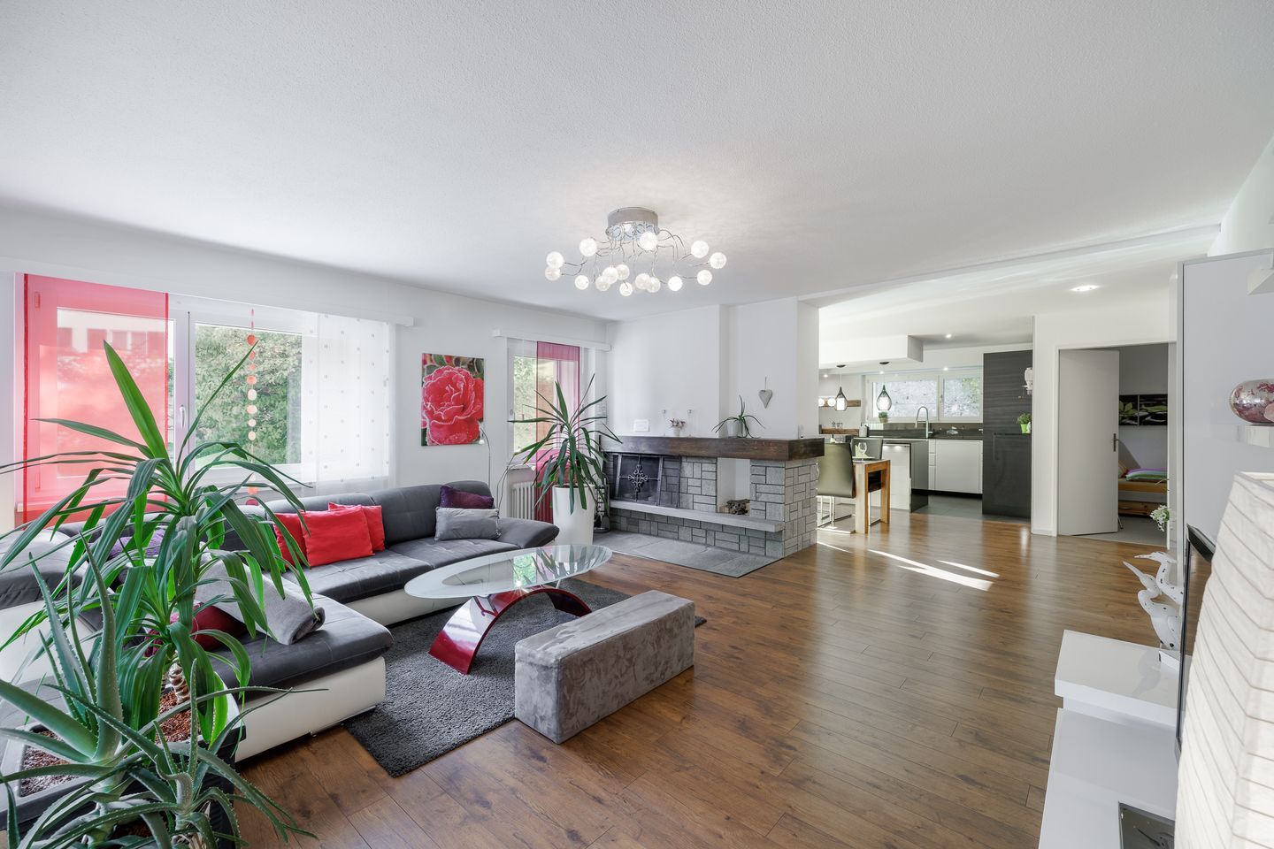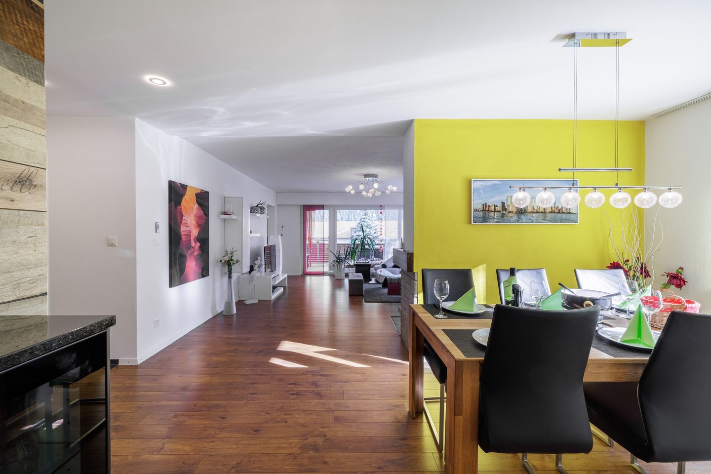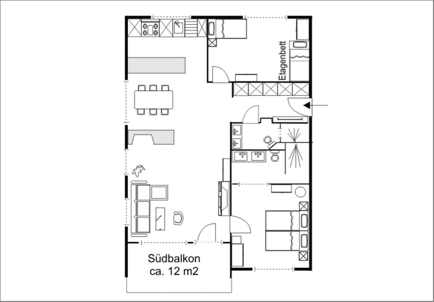 Die Ferienwohnung Sotsass A1 verfügt über eine helle Wohnstube mit offenem Kamin (Cheminée) und Ausgang zum Südbalkon. Optisch getrennter Essbereich mit Durchreiche zur Küche. Moderne und top eingerichtete Küche mit Geschirrspülmaschine und Mikrowelle + Kombisteamer. Elternzimmer mit Doppelbett (1.60m) mit direktem Zugang zum Ensuite-Badezimmer mit Doppellavabo, Regendusche & Toilette. Kinderzimmer mit Einzelbett (wahlweise zum Doppelbett ausziehbar) + Etagenbett. Separates Badezimmer mit Doppellavabo, Regendusche und Toilette. Reservierte Garagenbox. Nespresso-Kaffeemaschine, Gratis-WLAN u.v.m.