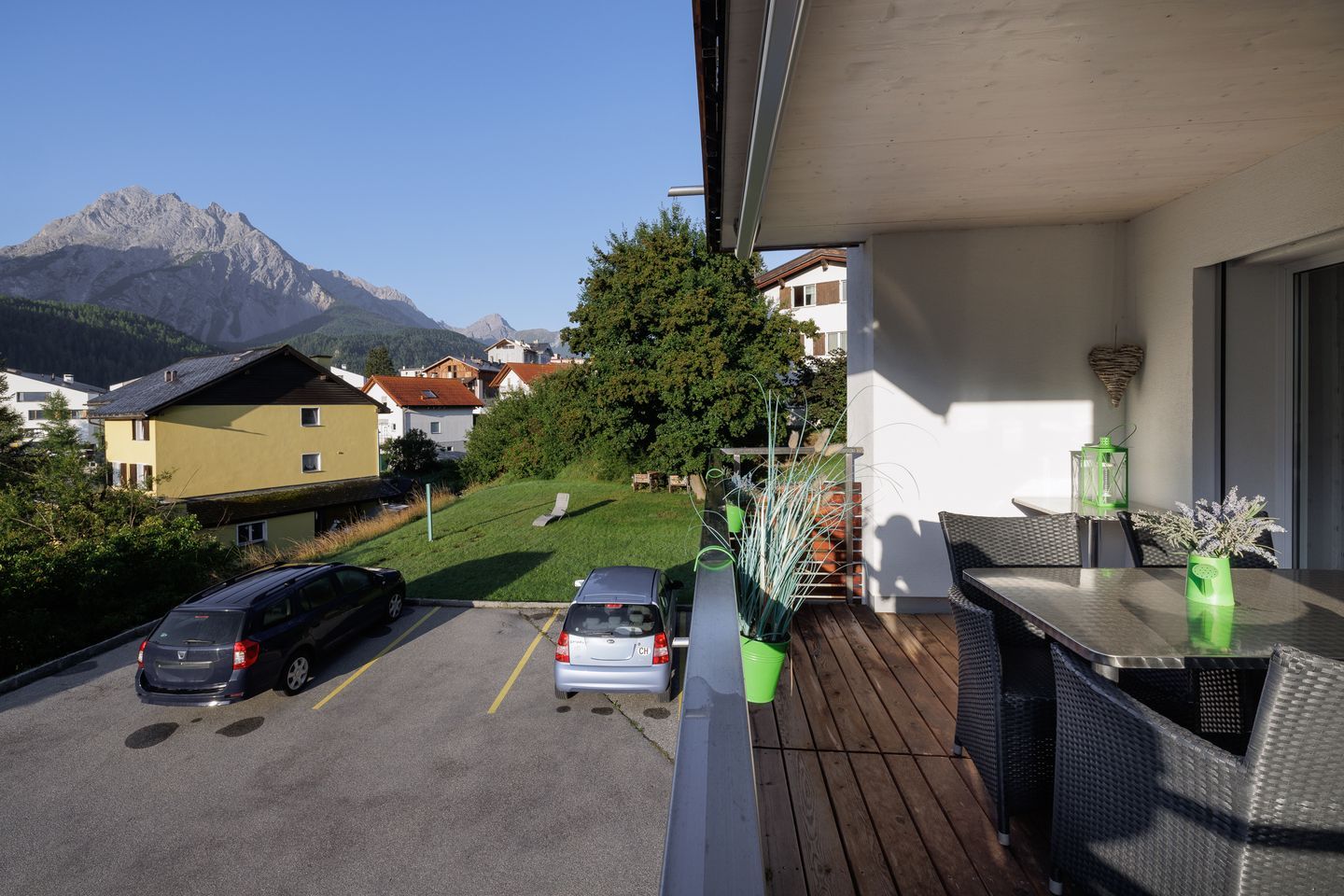 Vom Südbalkon (ca.14 m2) geniessen Sie einen tollen Panoramablick auf die Unterengadiner Dolomiten. Nur ca. 200m zur Haltestelle des Orts-/Skibusses und ca. 15 Gehminuten ins Zentrum von Scuol. Auch die Langlaufloipe beginnt in unmittelbarer Nähe.