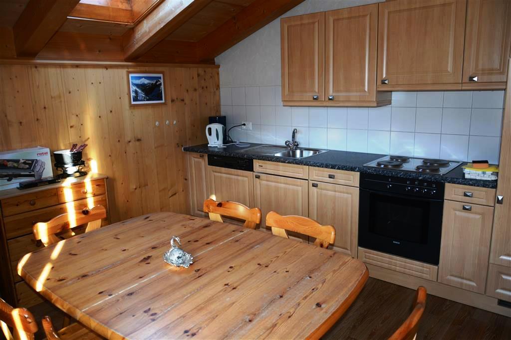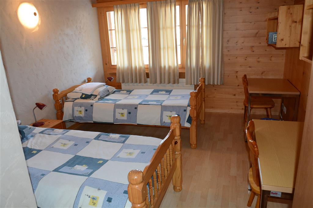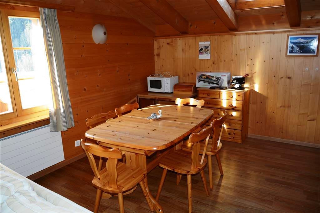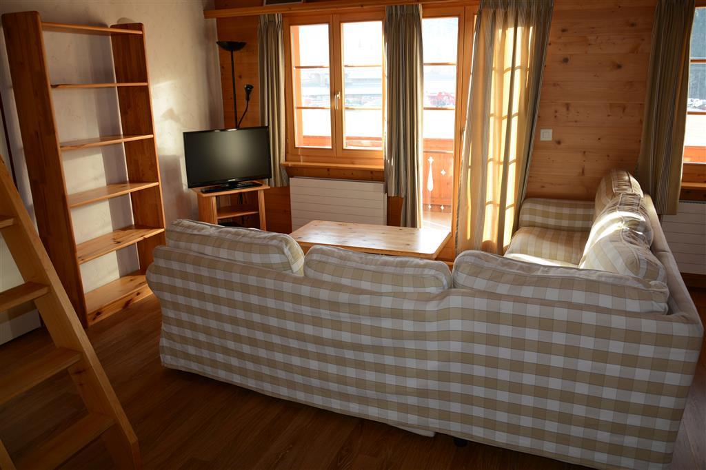 1 grosses Wohnzimmer mit Wohnecke, Kabel-TV/Radio, offener Küche mit Geschirrspüler, Filter-Kaffeemaschine, Fondue- und Raclette-Set. 1 Galerie (Dachschräge) mit französischem Bett (160x200cm). Separates Esszimmer, Badezimmer. 1 Schlafzimmer mit 1 Einzelbett (90x190cm) unten und 2 Einzelbetten (90x190cm) auf der Galerie, separates Badezimmer mit Dusche/WC. Balkon (Südseite). Die einzelnen Zimmer sind durch einen Korridor verbunden, welcher zusätzlich in die Ferienwohnung Jacqueline 24 führt. WiFi.