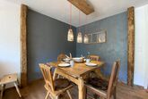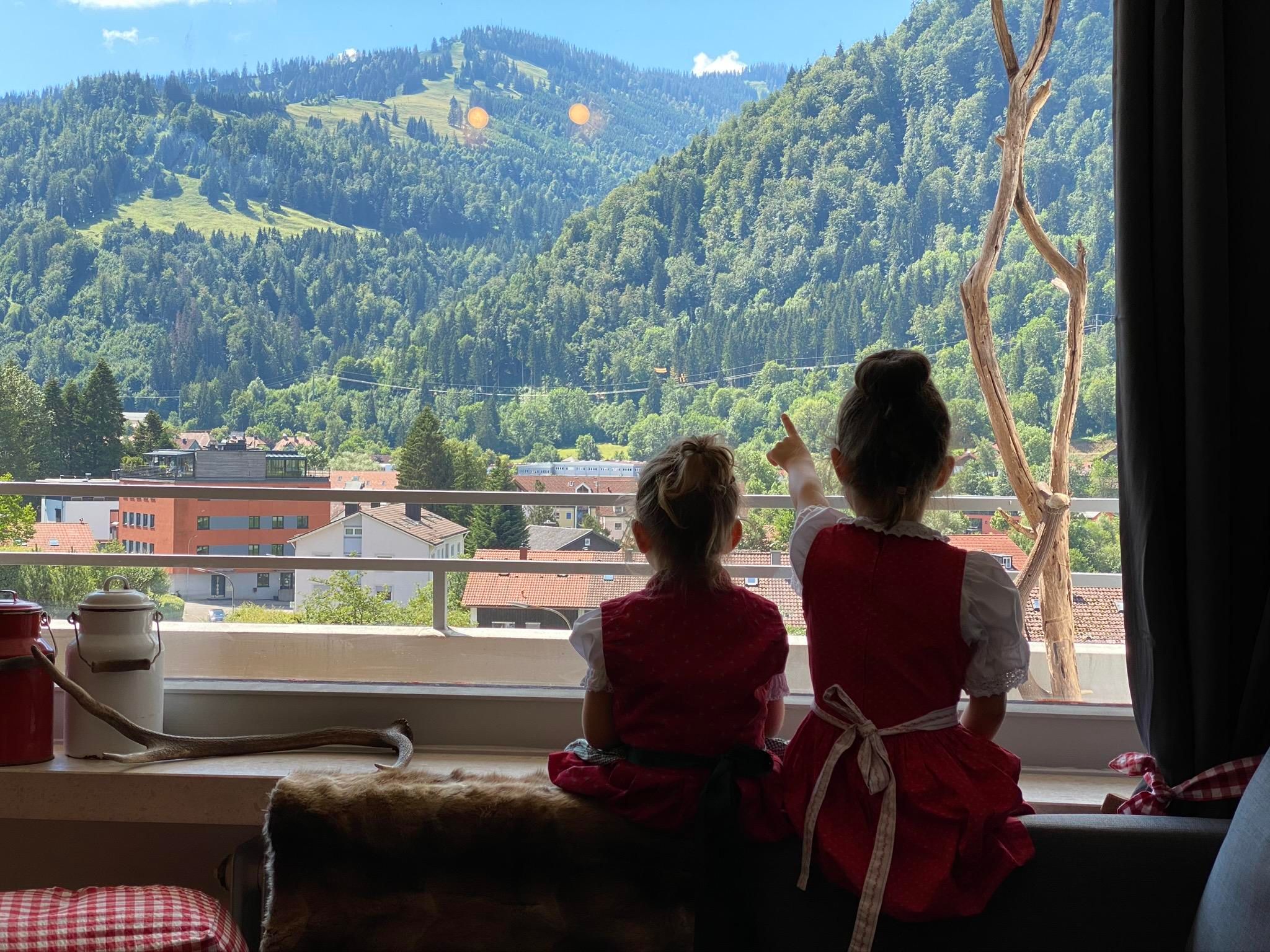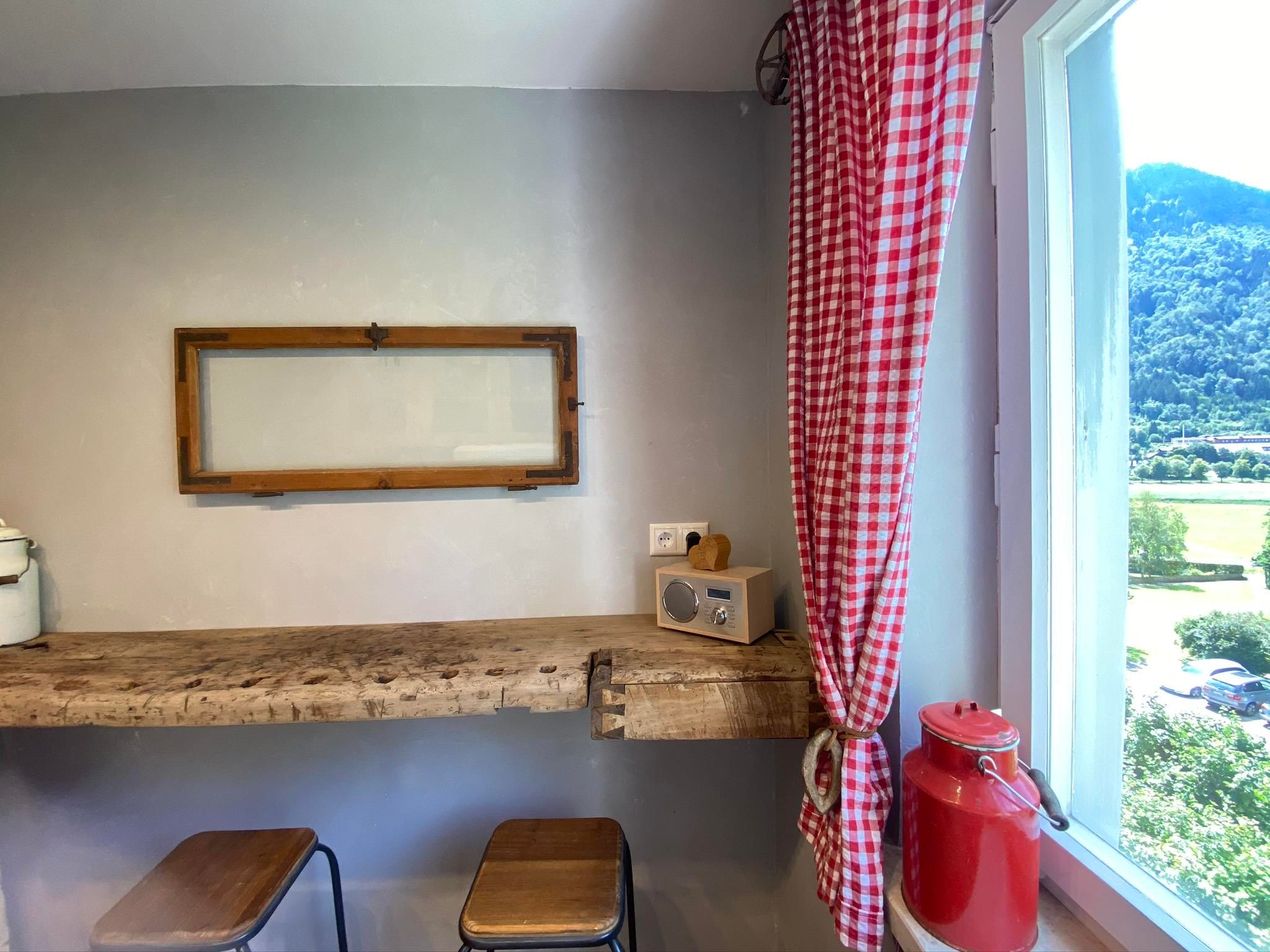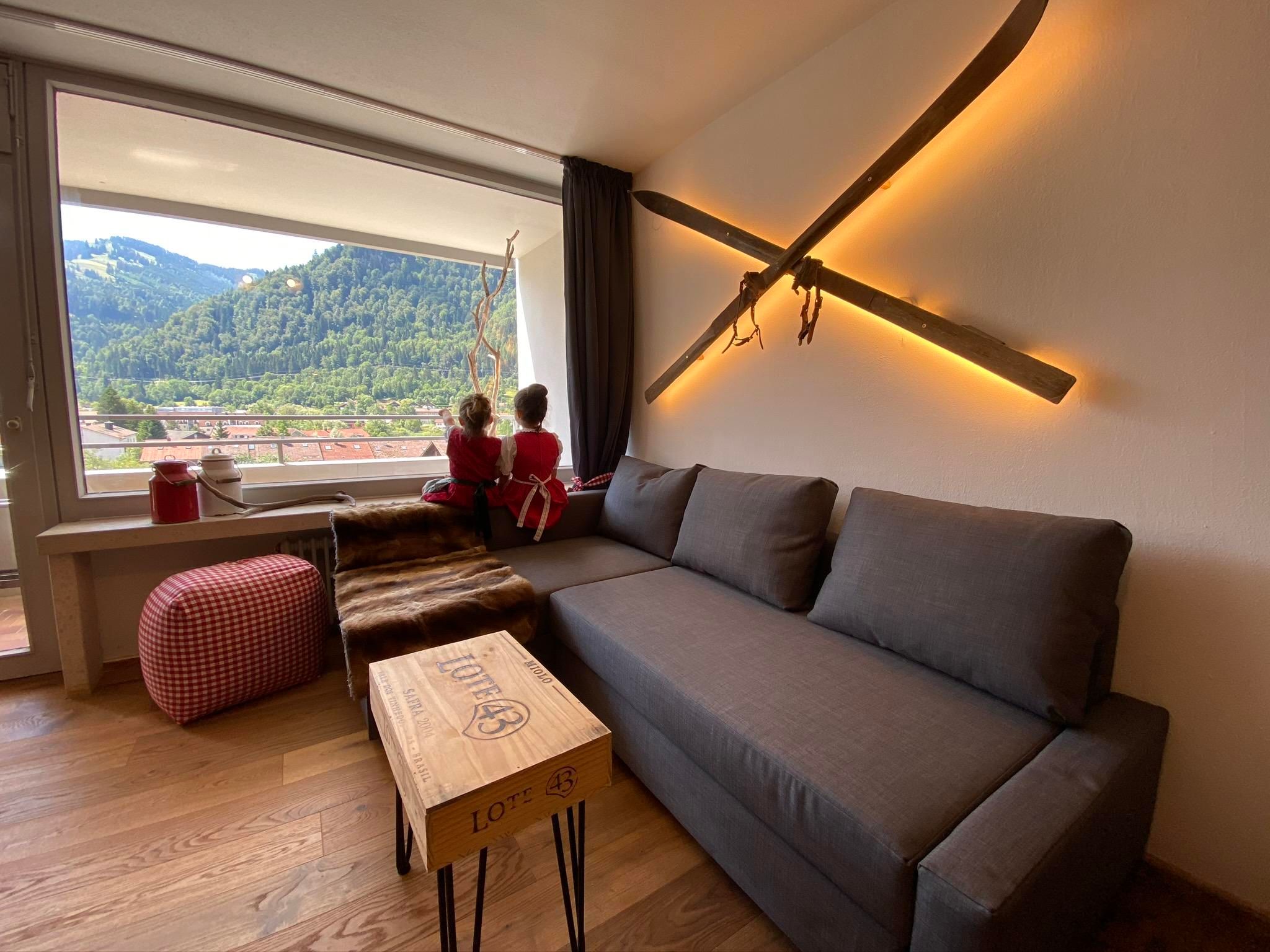Der Wohnbereich ist mit einem 200 Jahre alten Jogltisch und antiken Stühlen ausgestattet, um unter einer originellen Hängelampe das Abendessen zu genießen. Auf der Couch, die auch als Schlafcouch (200x140) umfunktioniert werden kann, könnt ihr durch das große Panoramafenster die Hausberge Mittag und Immenstädter Horn betrachten, oder aber auf dem 50 Zoll TV den Abend mit einer Netflix Serie und einem Glas Rotwein beenden.