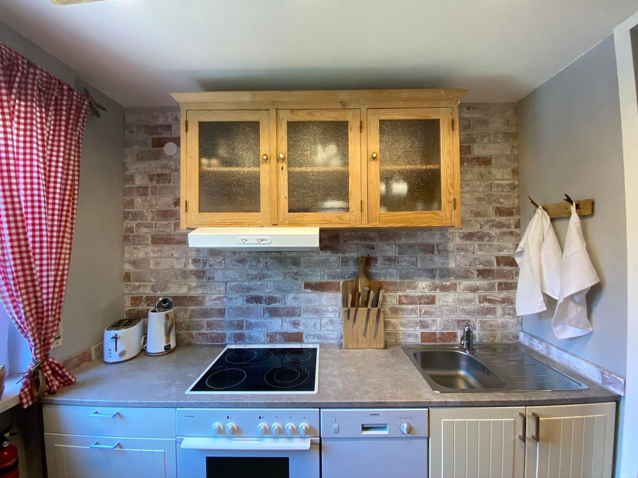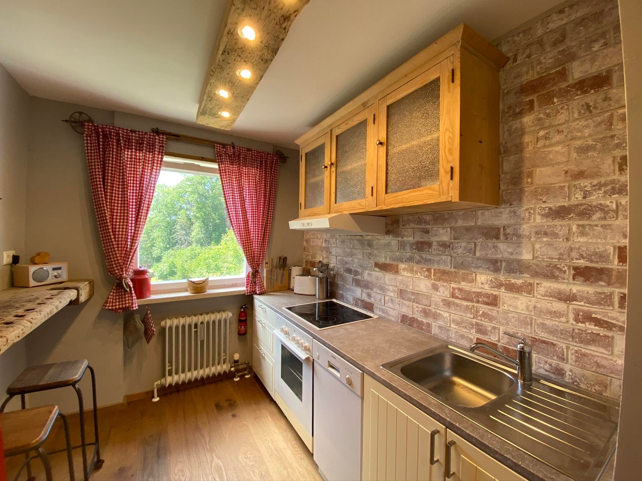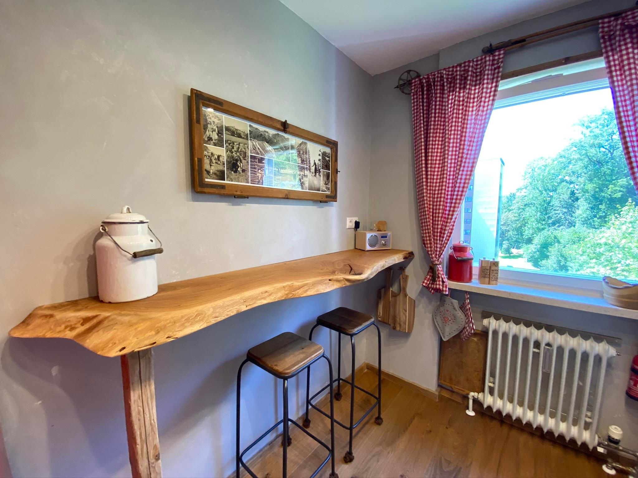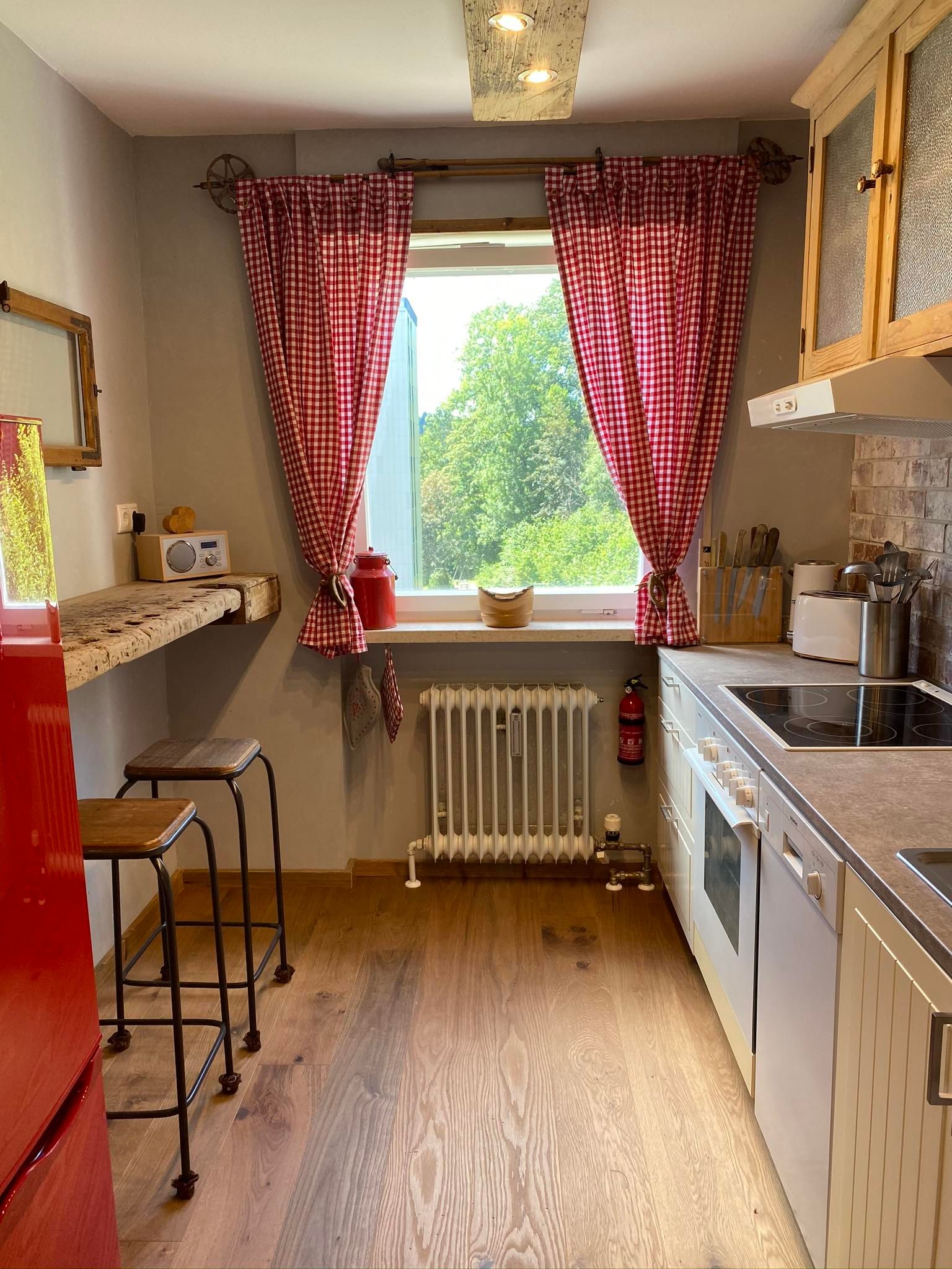 Die vollausgestattete Küche mit Herd, Backofen, Geschirrspüler, Kühl-Gefrierkombi, Kaffeemaschine, Toaster und zum Ambiente passendem Emaille-Geschirr lädt euch zu gemütlichen Kochabenden ein. Die Theke bietet Platz zum gemeinsamen Kochen oder einer bayerischen Brotzeit. Spülmaschinenpulver ist vorhanden, ein Müllschlucker auf der gleichen Etage 5 Meter entfernt.