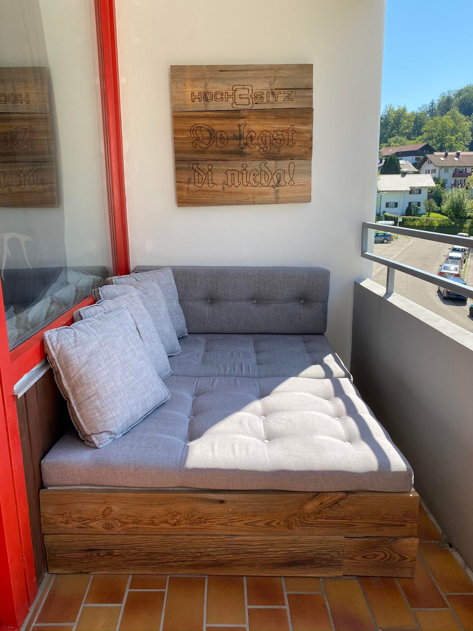 Auf dem ganztägig sonnigen Balkon erwartet euch eine gemütliche Lounge mit Blick in die Berge, hier hört man die Grillen zirpen, die Vögel zwitschern oder die Glocken der Kühe, die auf der Stadtalpe den Sommer verbringen.