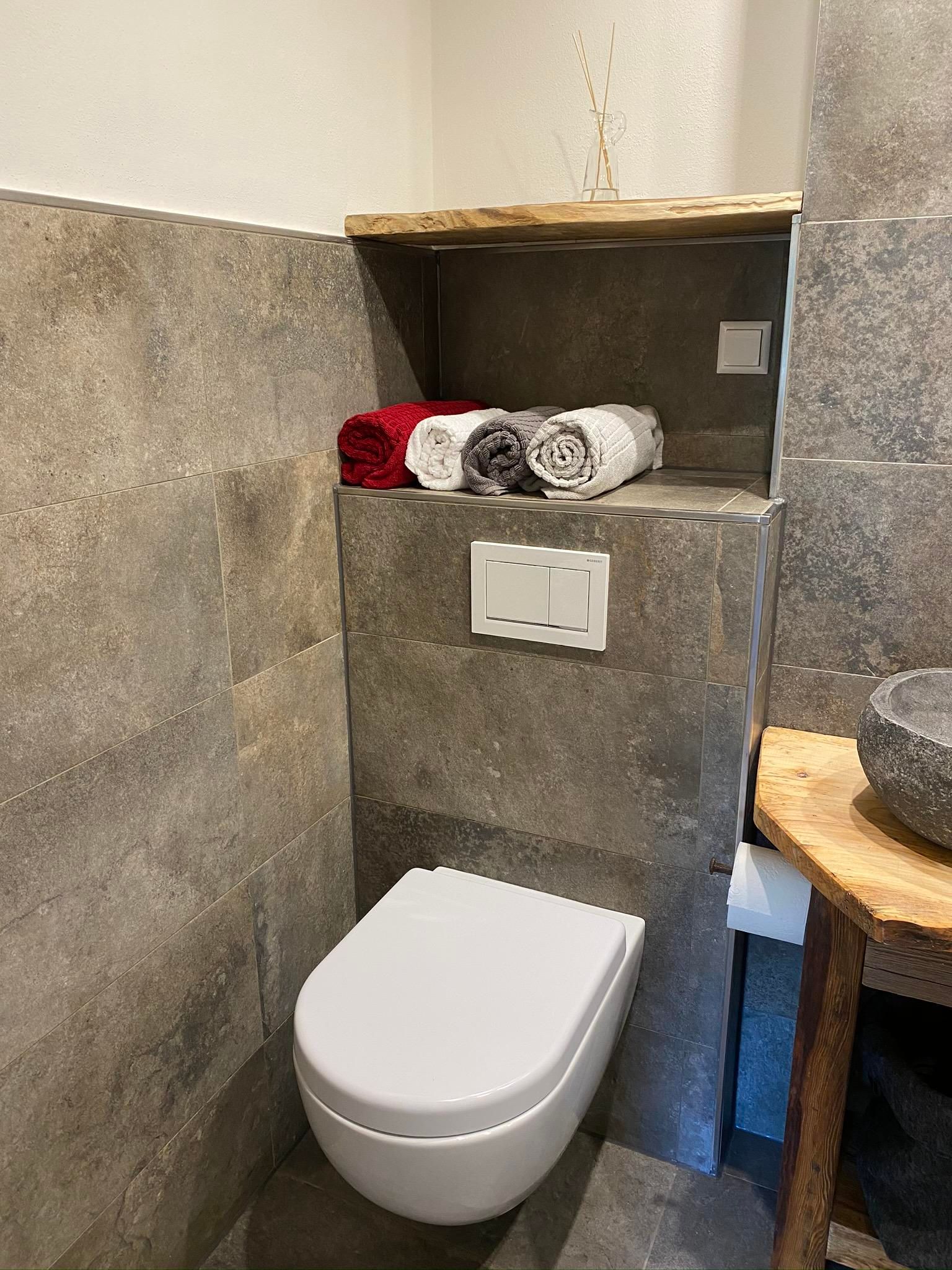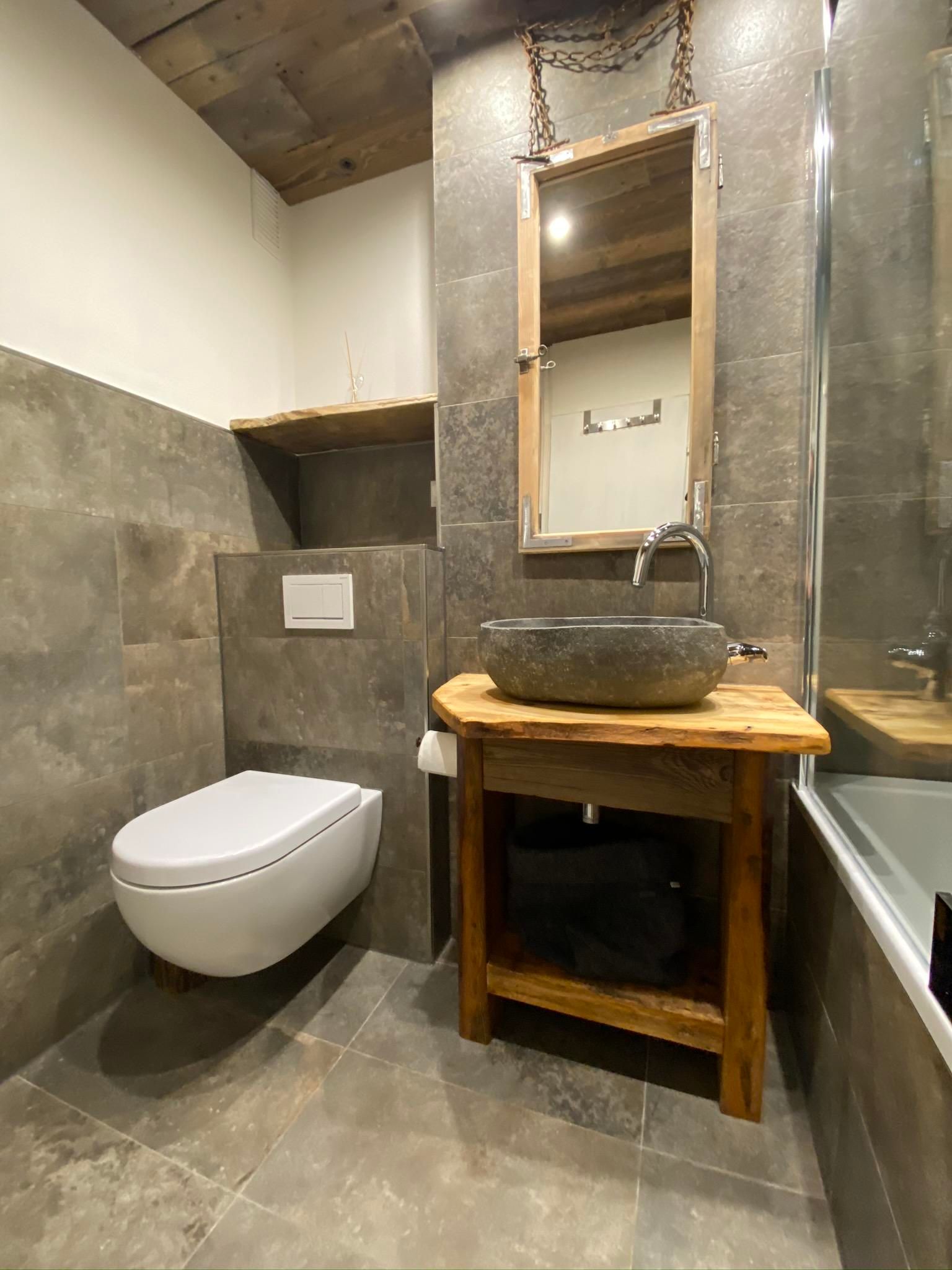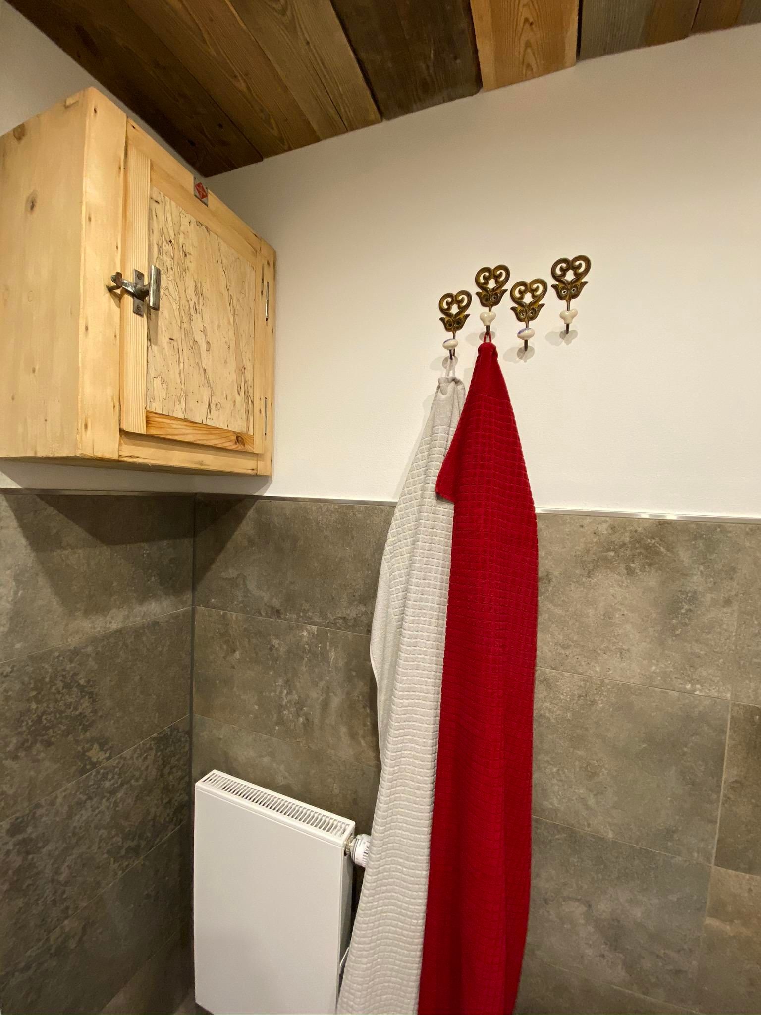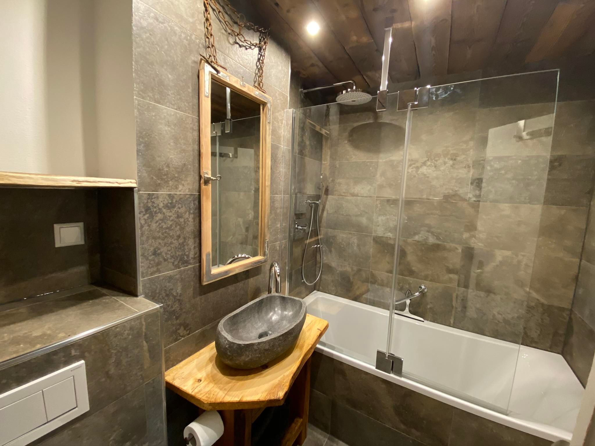 Nach einem sportlichen Tag könnt Ihr im neu renovierten und hellen Bad in der Badewanne mit Blick auf die Altholzdecke entspannen. Ein großer Spiegel, Haartrockner und für jeden Gast Hand- & Duschtuch runden das Bild ab.