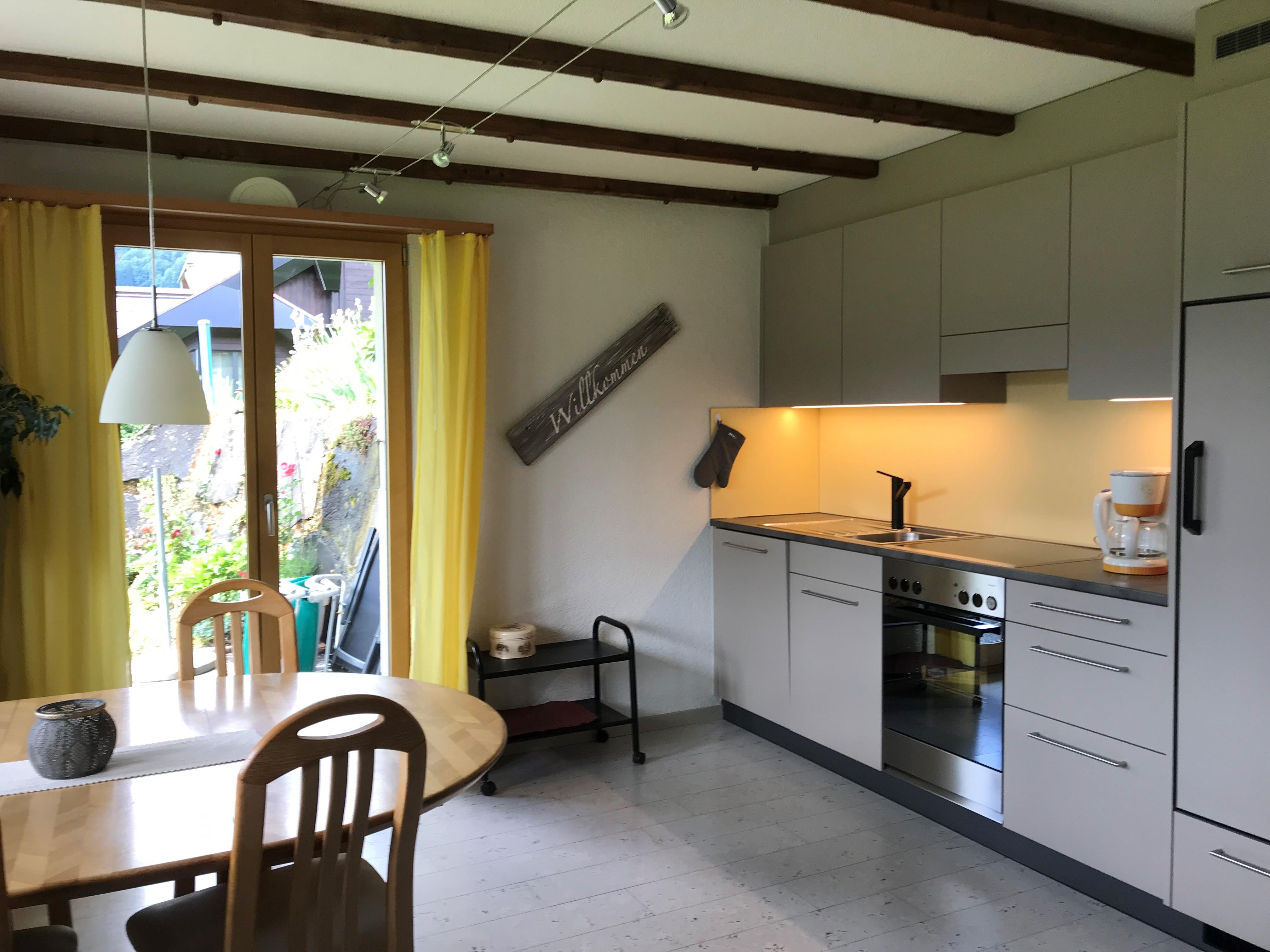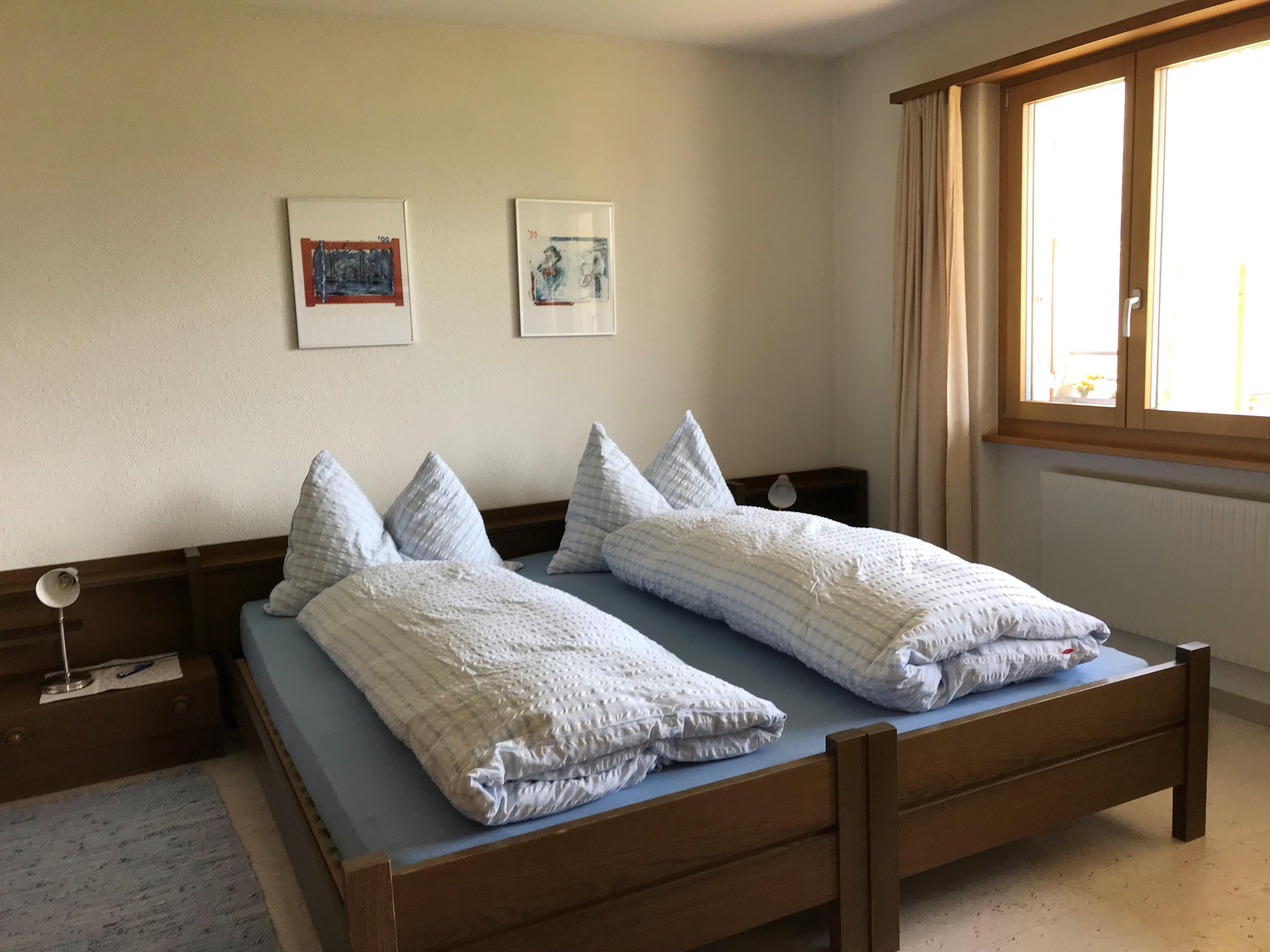 2-Zimmerwohnung im Parterre (45 m2) eines Einfamilienhauses. An erhöhter Lage, sonnig und ruhig, mit schöner Aussicht auf das Dorf und die Berge. 2 Autominuten oder 10 Gehminuten zu Fuss vom Dorfzentrum entfernt. 1 Schlafzimmer mit Doppelbett. (Zusätzliche Betten für 3./4. Person auf Ausziehsofa im Wohnzimmer, sowie Kinderbett auf Anfrage.) Dusch, WC, Nespresso, od. Filter-Kaffeemaschine, Wasserkocher, neue Küche mit Abwaschmaschine, Glaskeramikkochherd, Backofen, Kühlschrank mit Gefrierfach, Raclette- und Fondueset zum Benutzen. TV, Radio, Internetanschluss WLAN, Waschmaschinen-Mitbenützung, Heizung. Gartenmöbel und Grill, Sonnenterrasse, Parkplatz, Skiraum. Haustiere sind nicht erlaubt. Nichtraucherwohnung. Zentrale Lage für Ausflüge ins Ski- und Langlaufgebiet, für Wanderungen, schöne Biketouren/E-Bike. Öffentliches Hallen- und Schwimmbad mit Fitnessanlage!