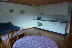 2-Zimmer-Wohnung 50 m2, im Erdgeschoss, geräumig und hells. Offenes Wohn-/Esszimmer mit Esstisch, Kabel-TV, Radio und CD. Ausgang zum Gartensitzplatz. 1 Doppelzimmer mit Ausgang zum Gartensitzplatz. Dusche/WC. Offene Küche (4 Kochplatten, Backofen, Geschirrspüler, Glaskeramikherd, elektrische Kaffeemaschine). Gartensitzplatz und Rasen mit Terrassenmöbel und Liegestühlen. Sehr schöne Panoramasicht auf die Berge, das Tal und die Ortschaft. Internetanschluss, Nichtraucher-Unterkunft. Haustiere sind nicht erlaubt.