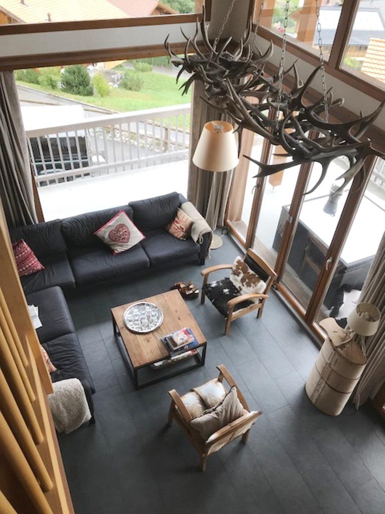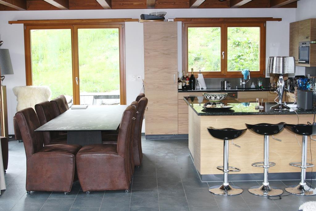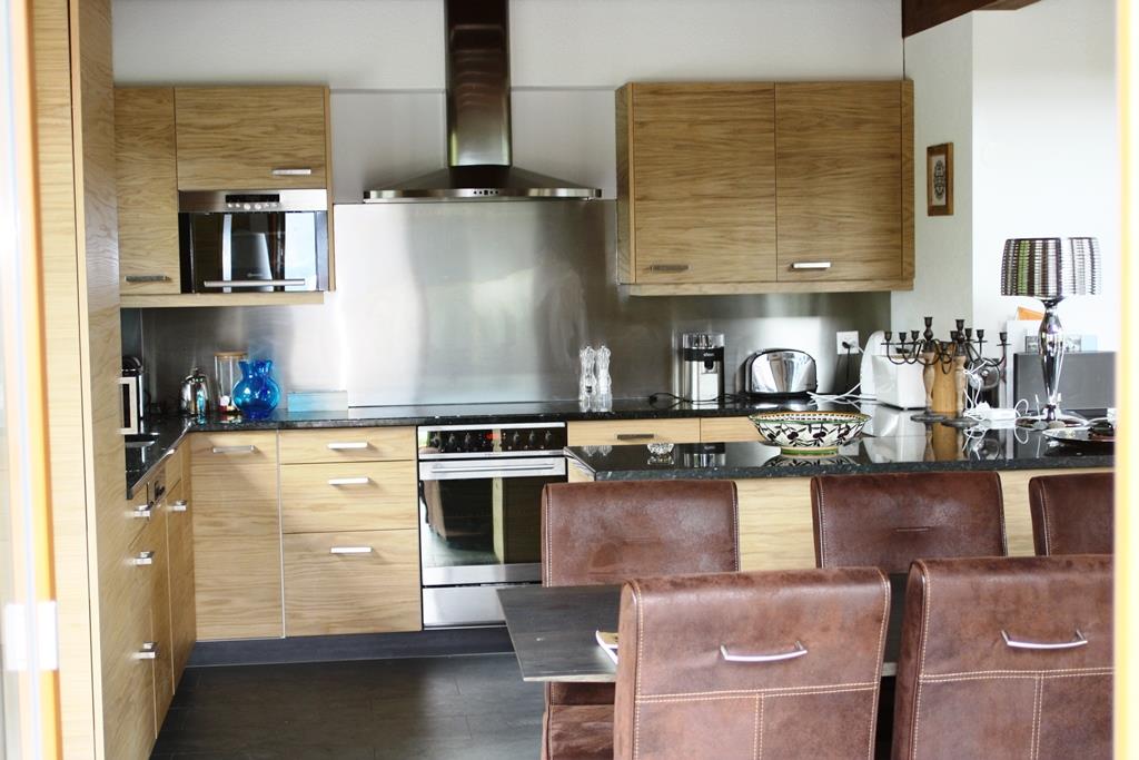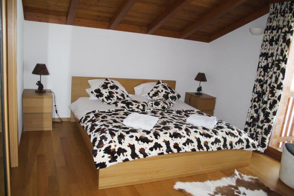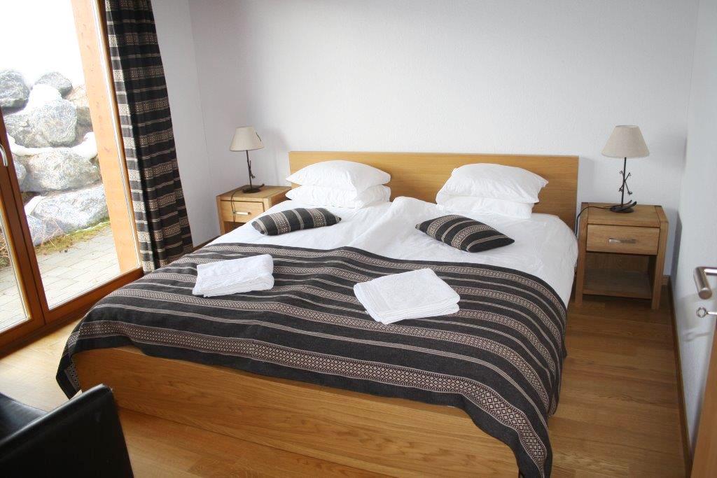 1. OG: 1 Schlafzimmer mit Doppelbett (180x200cm) und Dusche/WC. Wohnzimmer mit Essbereich und Cheminée sowie offener modern eingerichteter Küche (u. a. ausgestattet mit Kapsel-Kaffeemaschine (Nespresso), Fondue-Set). Grosser Balkon/Terrasse mit zwei Sitzplätzen.