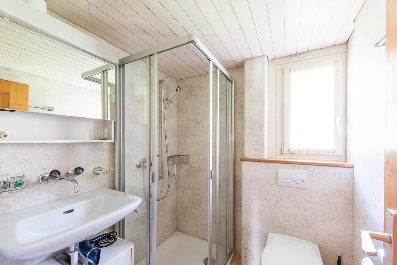 Schlafzimmer: Parkettboden, Doppelbett und 1 Einzelbett zwei Nachtische mit Nachtischlampe, Kleiderschrank inkl. Bügel, Stuhl, Badezimmer: Dusche mit Schiebewände, Toilette, kleine Kommode mit Froteewäsche, Lavabo mit Spiegelschrank, Fön,