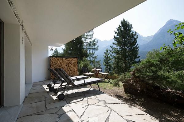 Der Außenbereich der Chasa Diala ist eine Oase der Ruhe und Entspannung. Gäste können auf der geräumigen Terrasse und Liegewiese Sonne tanken oder im privaten Garten verweilen. Zwei Garagenboxen und zusätzliche Parkplätze sorgen für bequeme Anreise und Mobilität vor Ort. Für Winterfreuden stehen zwei große Davoser Schlitten bereit, um die Umgebung zu erkunden.