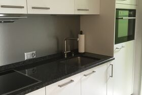 Neue, offene und moderne Küche mit Essbereich, Backofen, Kühlschrank, Geschirrspüler, Kaffeemaschine, Wasserkocher.Andere Räume