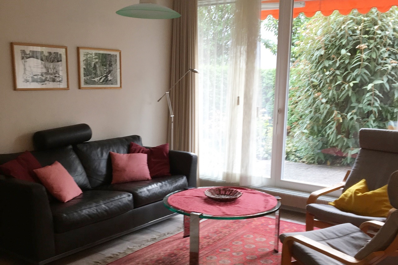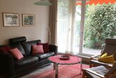 Offenes Wohnzimmer mit einem Sofa, Cheminée, Kabel-TV, Telefon, Radio, CD-Player und Zugang zum Gartensitzplatz.Küche