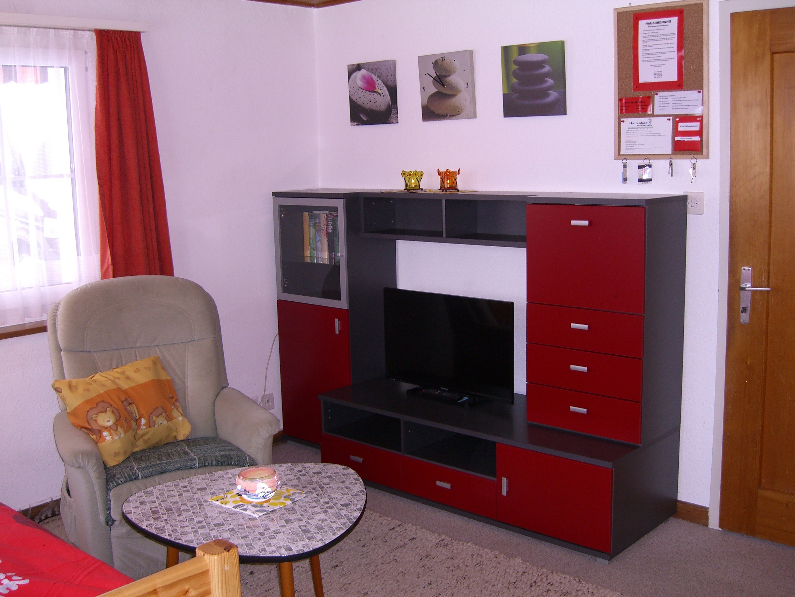 Alle drei Ferienwohnungen sind gemütlich eingerichtet und verfügen über ein Wohnzimmer mit Sofa, Schlafgelegenheit und Flachbild-TV, ein Essbereich mit Esstisch, Bank und Stühlen sowie eine kleine Küche mit allem was man braucht. Badezimmer mit WC, Badewanne oder Dusche.