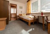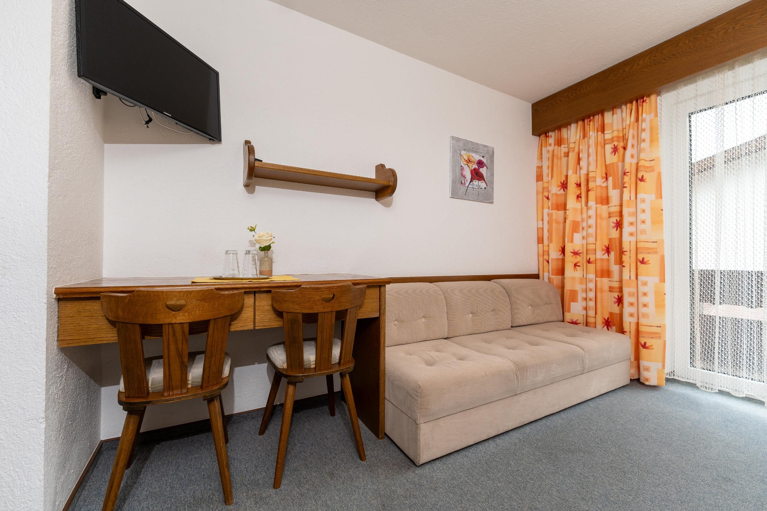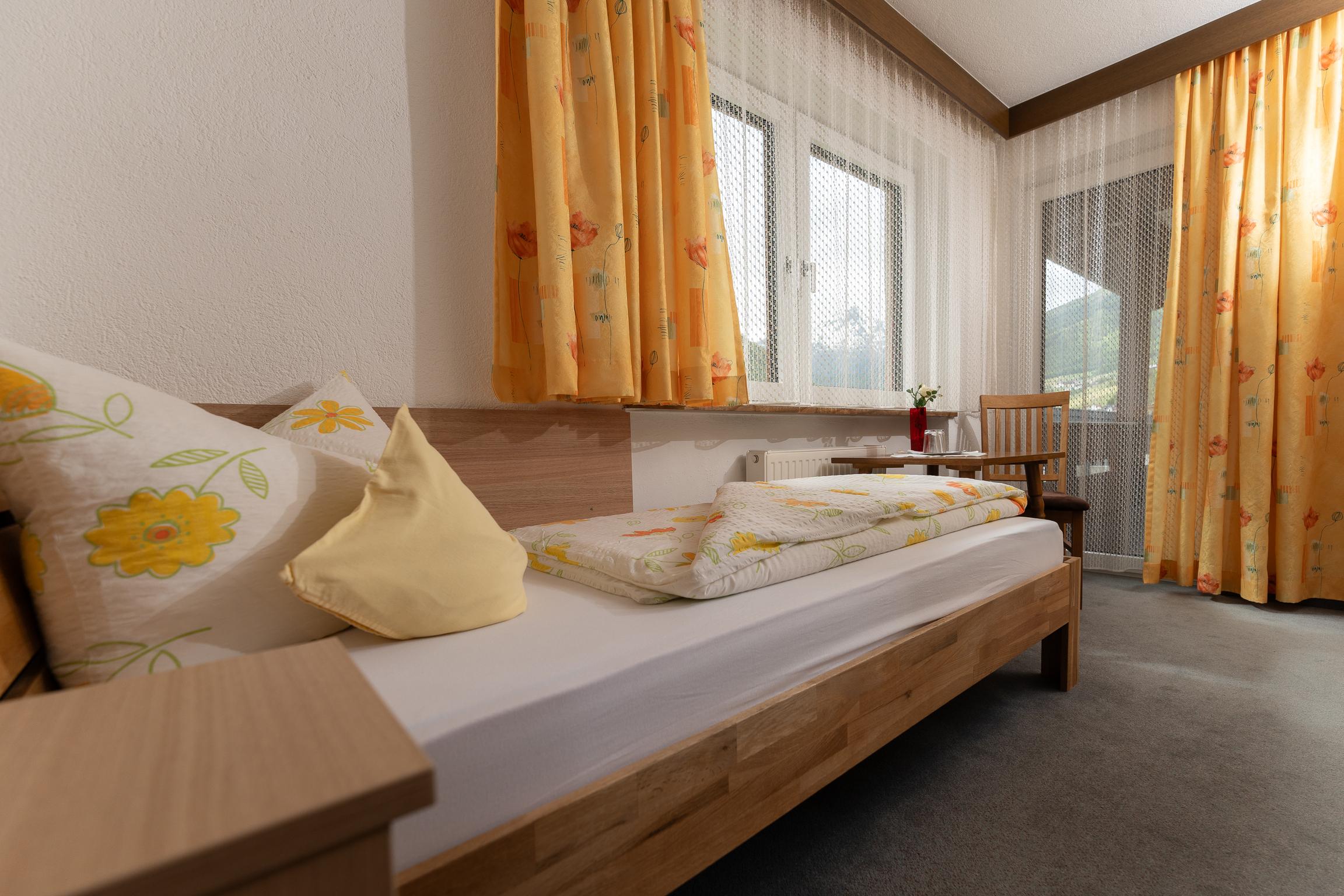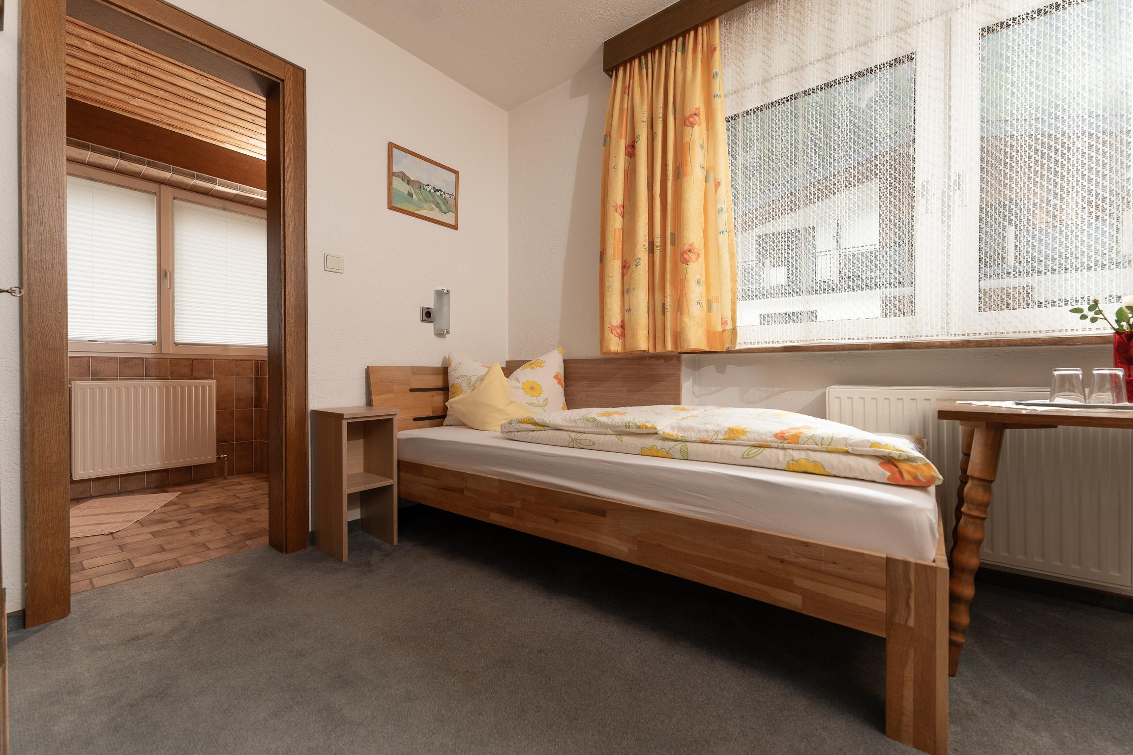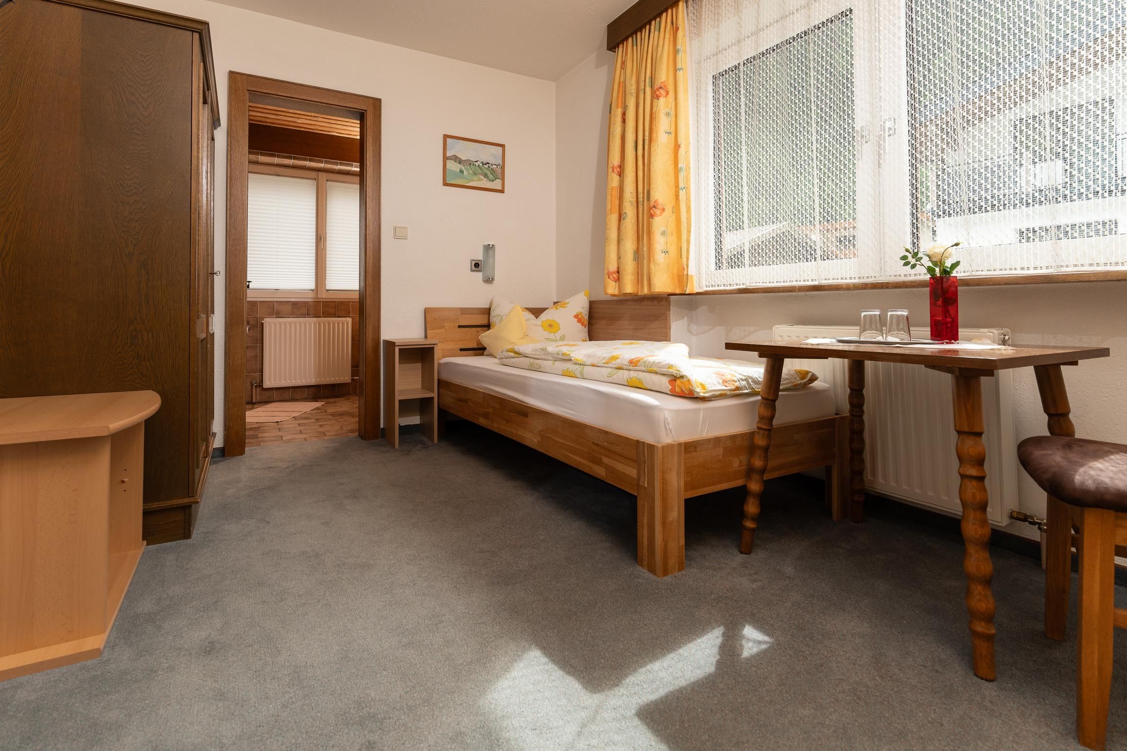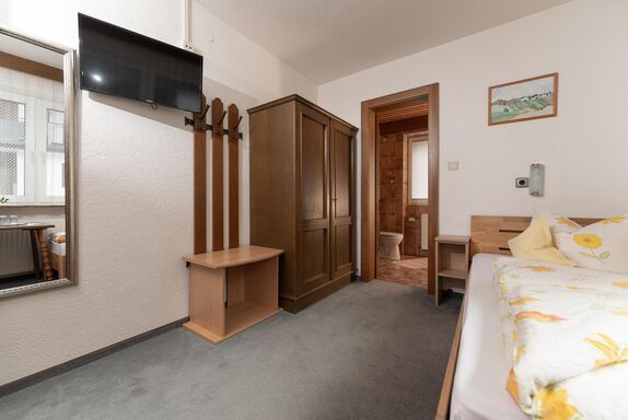 Gemütlich, hell und geräumig eingerichtetes Einzelzimmer mit Flat- TV, Radio, Badezimmer mit Badewanne und WC & Fön, großer Balkon.