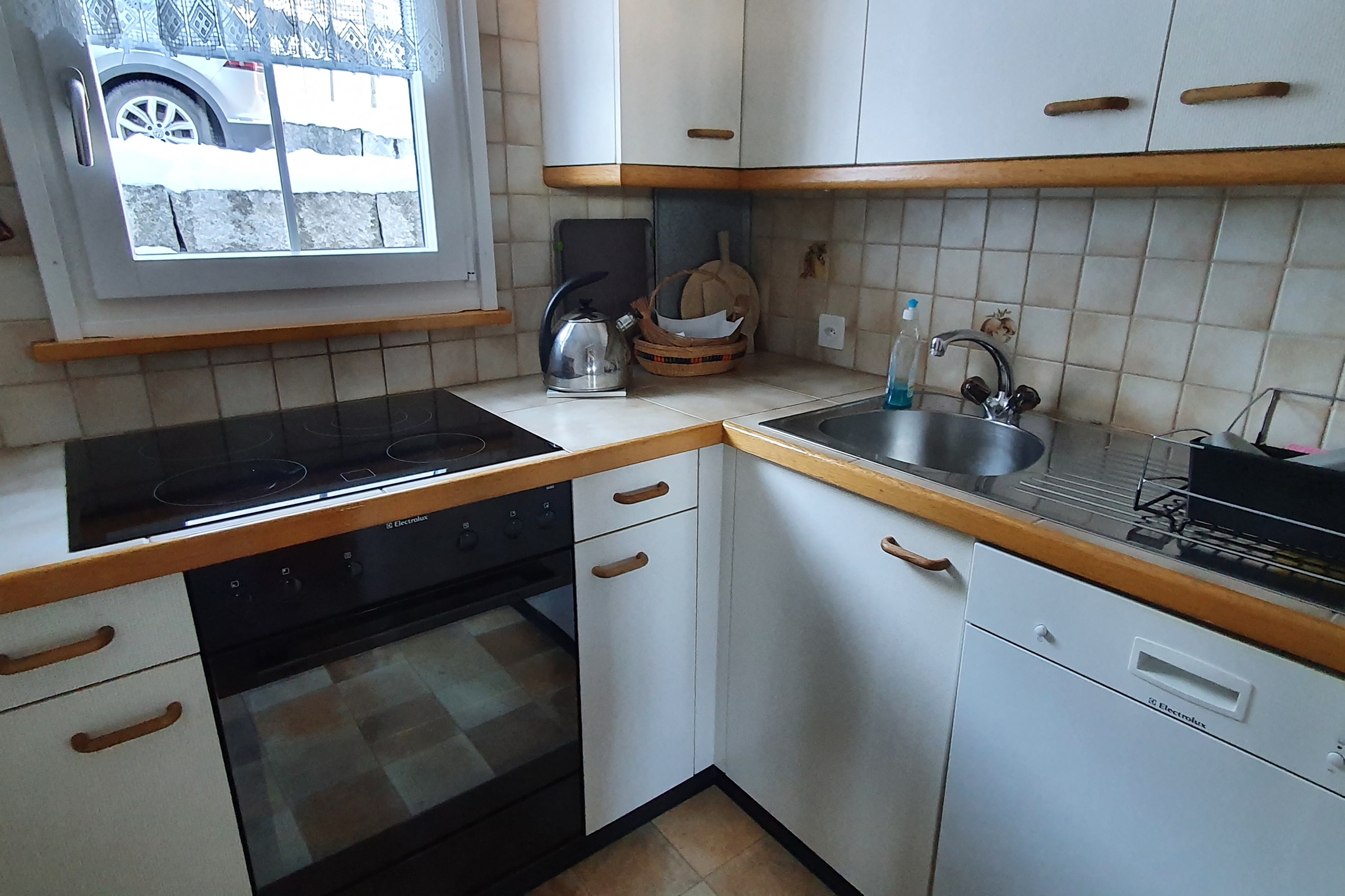 Die Küche ist ausgestattet mit einem Backofen, Herd, Kühlschrank, Geschirrspüler, Wasserkocher und Kaffeemaschine. Inneneinrichtung