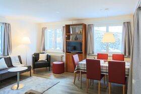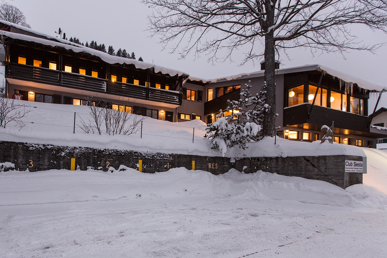 Das Clubhaus Siesta verfügt über zwei sanierte und möblierte 3-Zimmer-Wohnung mit 5 Betten (2+3), und ein saniertes Studio mit 2 Betten. Zudem verfügt es über eine gediegene und sehr gut ausgestattete Gruppenunterkunft (Clubtrakt) für Selbstkocher mit 23 - 27 Betten (3+3+7+10), grosszügigen Nebenräumen sowie über einen separaten Saunabereich. Eigene Parkplätze mit ganzjähriger Zufahrt für PWs und Kleinbusse vor dem Haus. Spiel- und Liegewiese mit Aussengrill (Sommer). In Schrittnähe zur Prodalpbahn (Gondel), den Dorfläden.