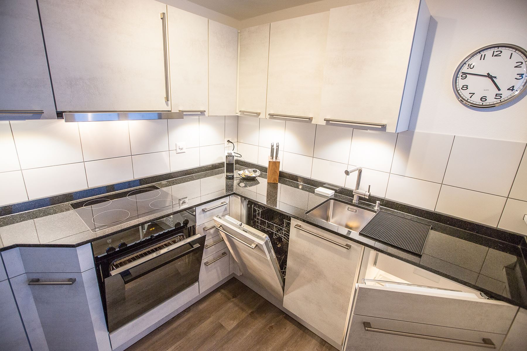 Ein komplett saniertes und möbliertes Studio mit 2 Betten, voll ausgestattete Küche, Bad/WC, TV mit Kabelanschluss, Radio und WLAN. Zwei Boxspring Betten mit Fixleintuch und nordischem Duvet.
