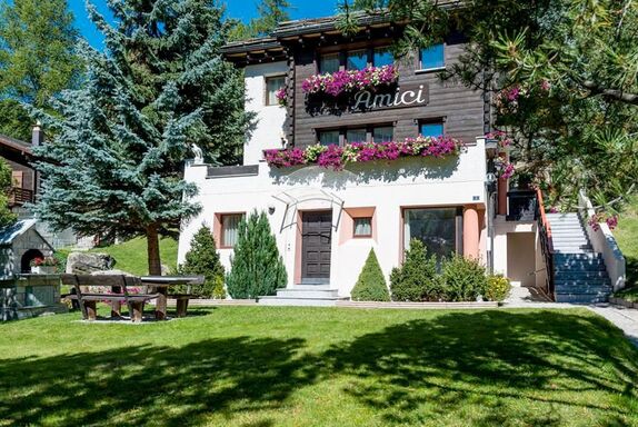 Das Haus Amici befindet sich in sehr sonniger und ruhiger Lage, umgeben von einer herrlichen Liegewiese mit Gartencheminée. Blick auf die Mischabel-Bergkette.