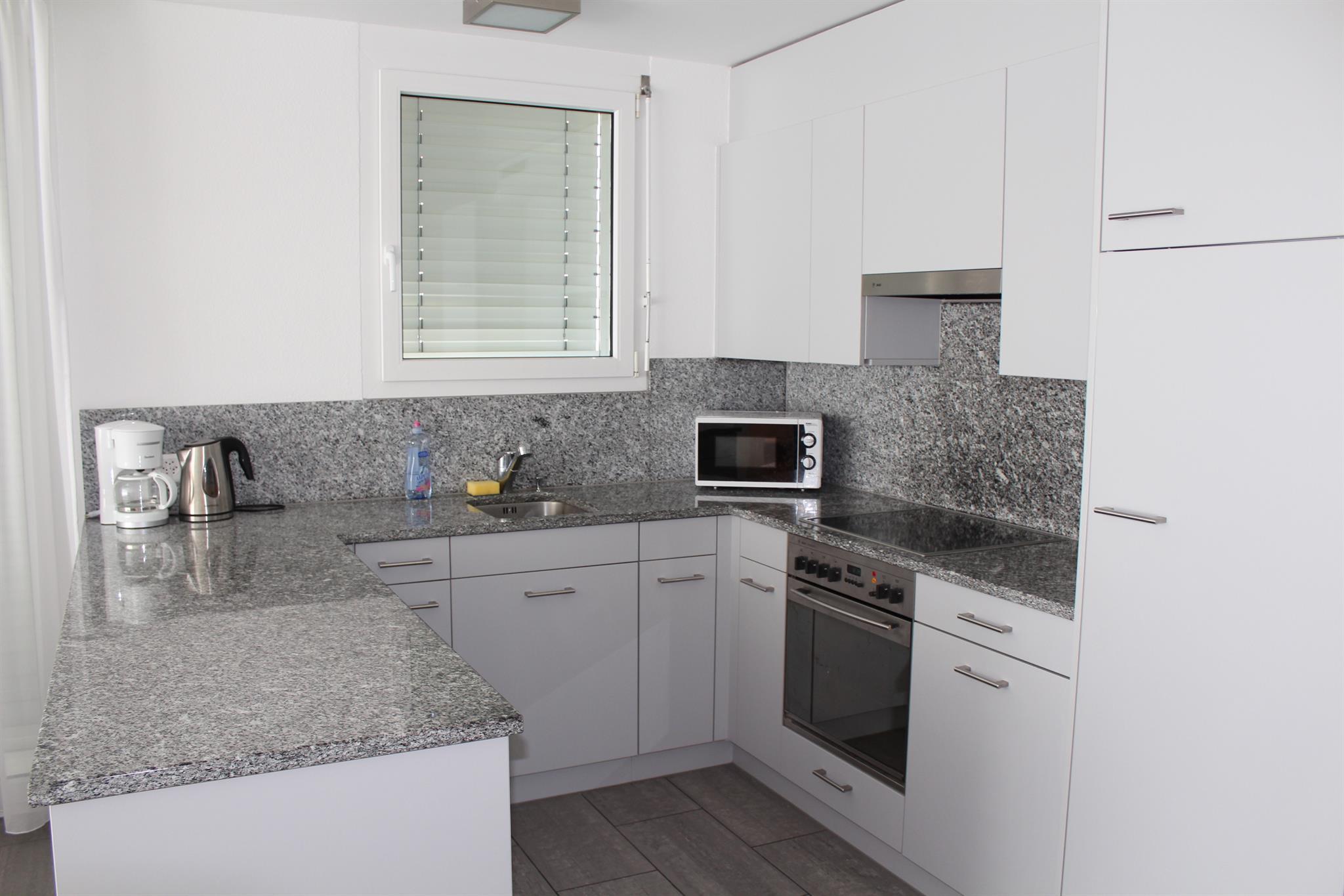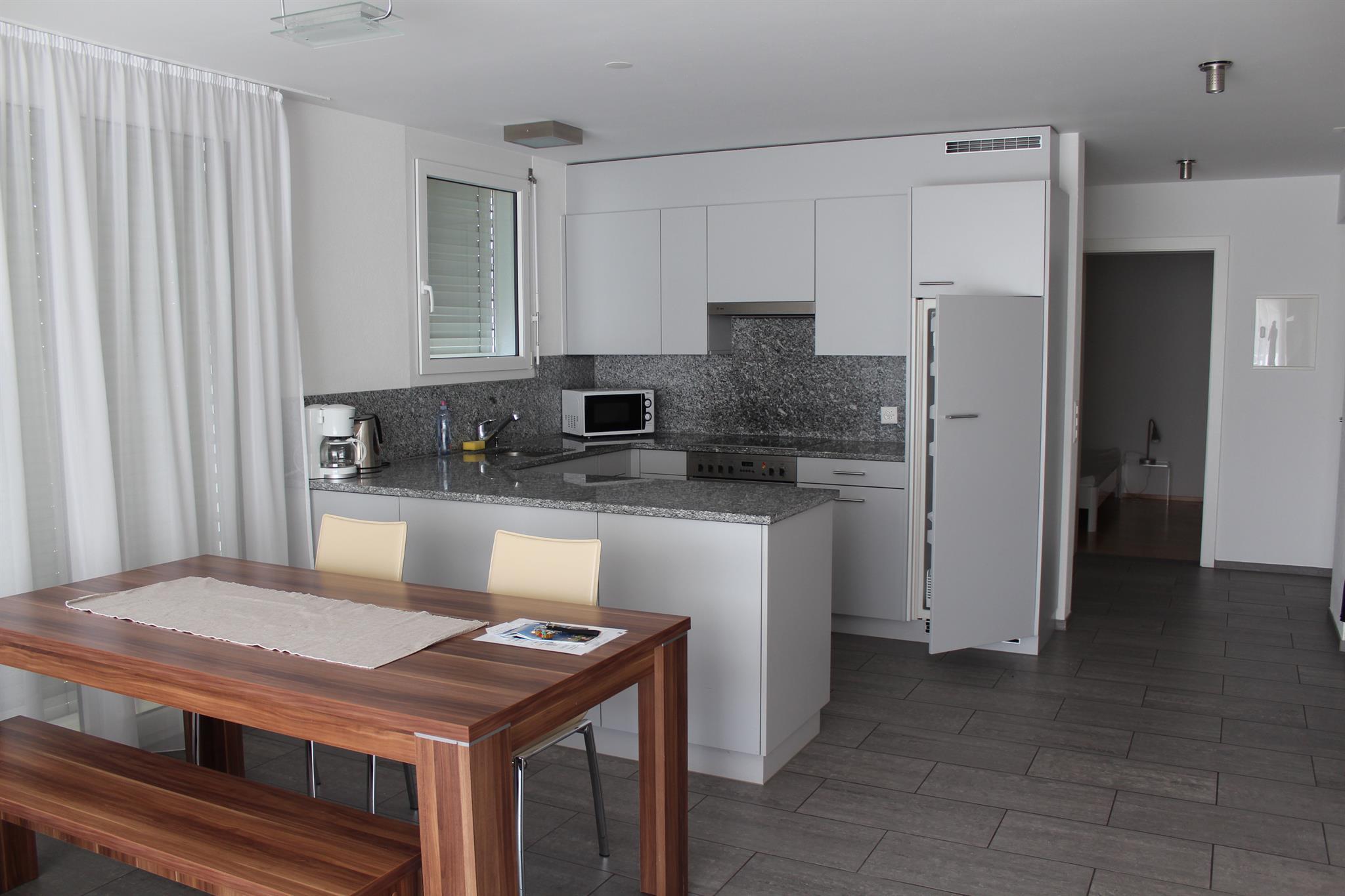 3 ½ Zimmerwohnung (ca. 84m2) im 2. OG, Mehrfamilienhaus mit Lift, Balkon, Autoabstellplatz in Garage, Mitbenützung des Skiraumes und der Waschmaschine. Küche mit Backofen, 4-Plattenglaskeramikherd, Kühlschrank mit Tiefgefrierfach, Geschirrspülmaschine; 1 Bad/WC und 1 DU/WC; 2 Schlafzimmer mit je 1 Doppelbett; Wohnzimmer mit Polstergruppe, Essecke; Bettwäsche, Frottéewäsche, Küchentücher, Duvet nordisch; TV, WLAN, Abfallsäcke blau. Haustiere nicht erlaubt. Nichtraucher-Wohnung!