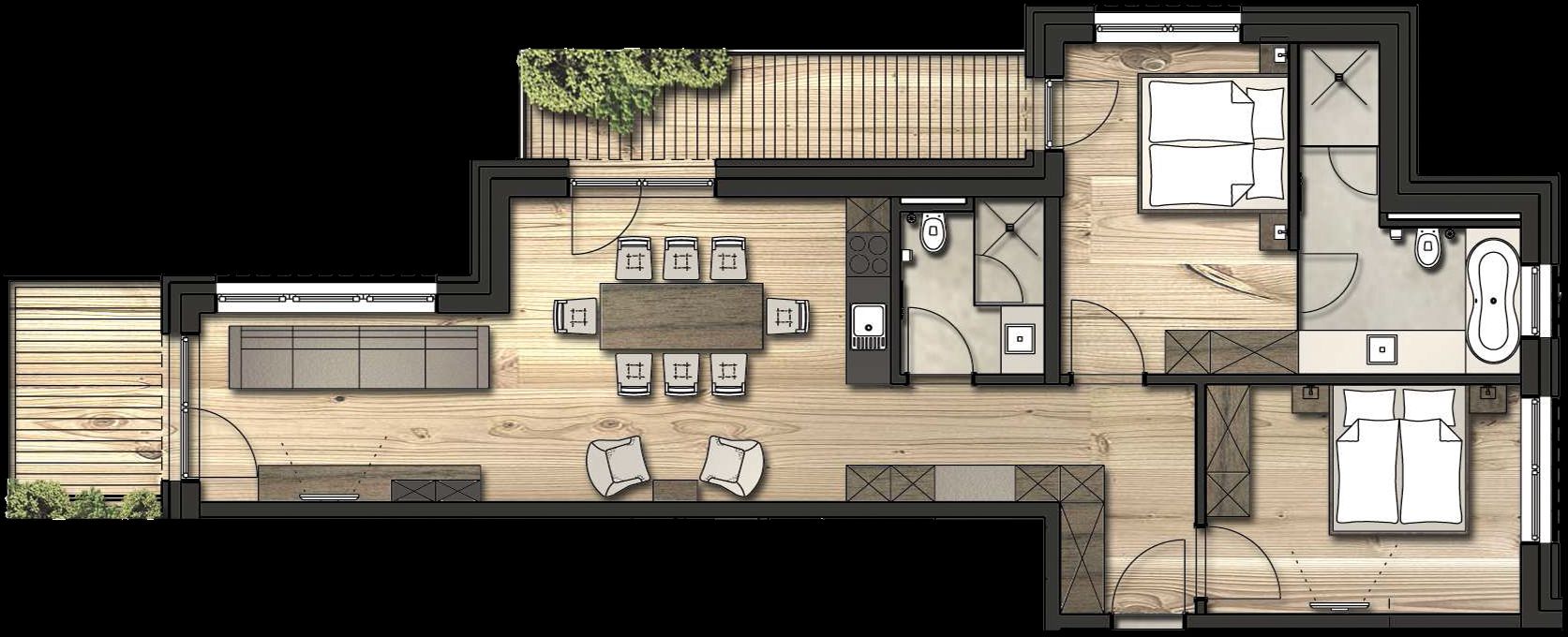 Apartment 12 für 4 Personen, ca. 82 m², mit 2 seperaten Doppelzimmern, 2 Bäder mit WC, Waschmaschine, Kochnische & Küchenaussstattung, gemütlichem Wohnbereich mit Esstisch, Balkon.