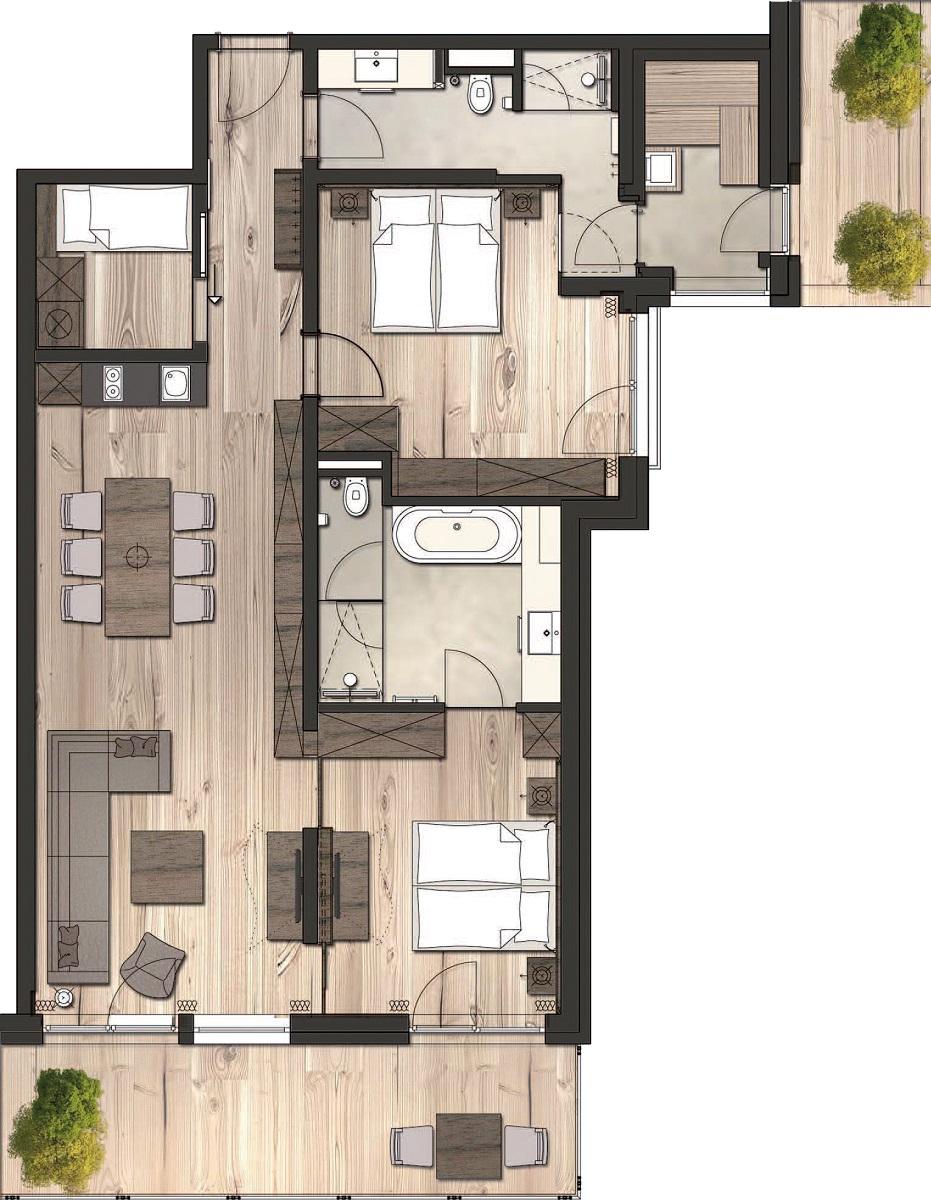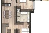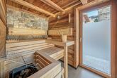 Apartment 9 für 5 Personen, ca. 99 m², mit 1 Doppelzimmer, 1 Doppelbett im Wohnbereich (mit Schiebetüren getrennt), 1 Einzelzimmer, 1 Bad mit WC, private Sauna mit Dusche und WC, Kochnische mit Spülmaschine & Küchenaussstattung, Waschmaschine, gemütlichem Wohnbereich mit Esstisch, Balkon.