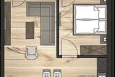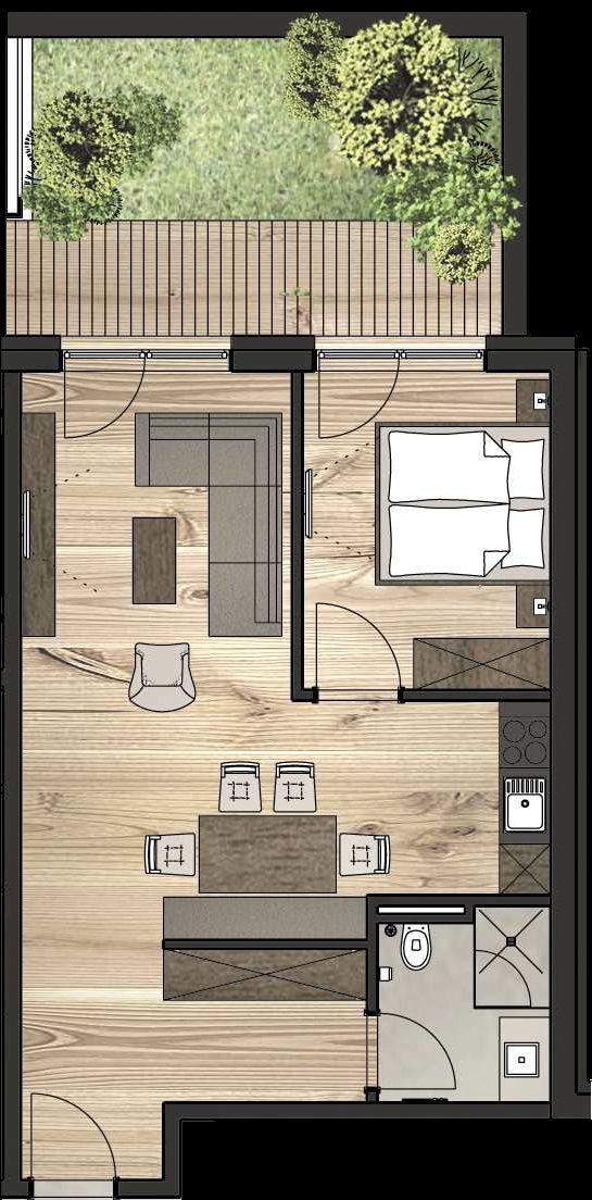 Apartment 7 für 2 Personen, ca. 53 m², mit 1 Doppelzimmer, 1 Bad mit WC, Kochnische & Küchenaussstattung, gemütlichem Wohnbereich mit Esstisch, Balkon mit eingeschränktem Ausblick.