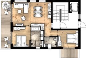 Apartment 24 für 4 Personen, ca. 76 m², mit 2 seperaten Doppelzimmern, 2 Badezimmern (1x Badewanne/WC und 1 x Dusche/WC), Kochnische & Küchenaussstattung, gemütlichem Wohnbereich mit Esstisch, Balkon.