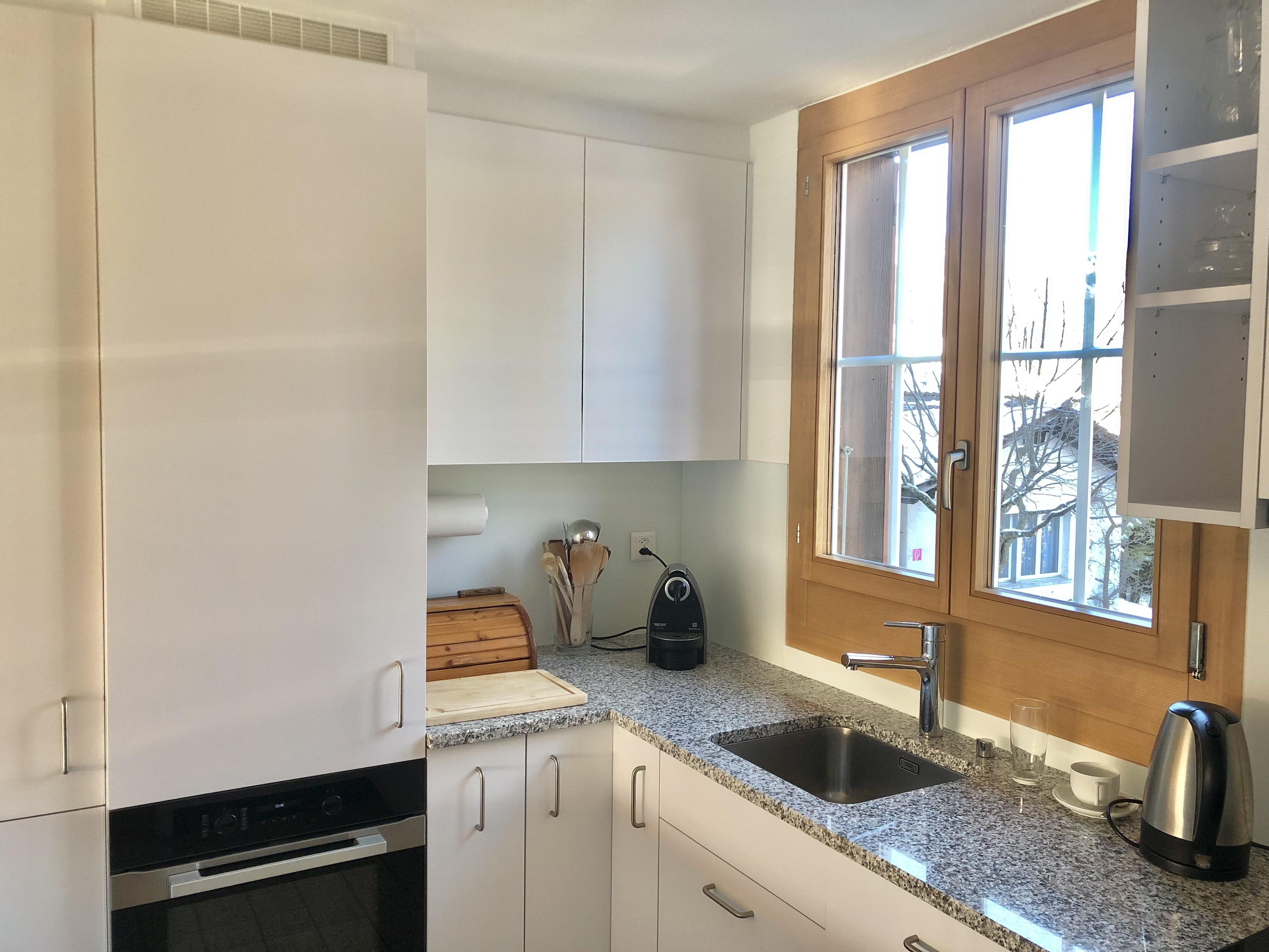 1. Stock: Wohn-/Esszimmer mit TV (Kabel) und WiFi. Küche u.a. ausgestattet mit Geschirrspüler, Fondue-Set, Kapsel-Kaffeemaschine (Nespresso). Separates WC.