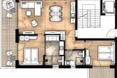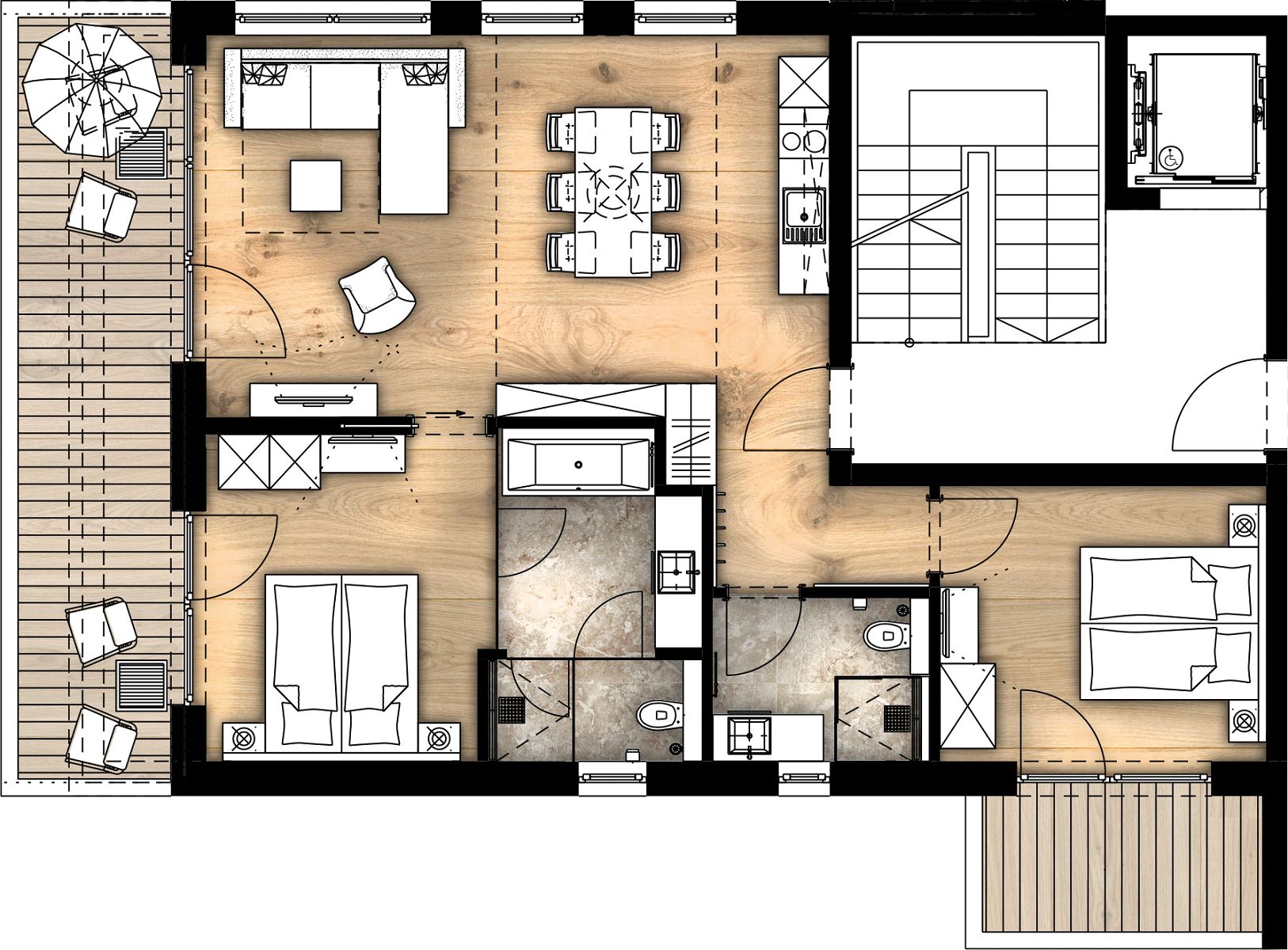 Apartment 23 für 4 Personen, ca. 76 m², mit 2 seperaten Doppelzimmern, 2 Badezimmer mit Dusche/WC bzw. Badewanne/WC, Kochnische & Küchenaussstattung, gemütlichem Wohnbereich mit Esstisch, Balkon.