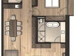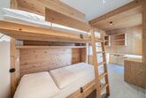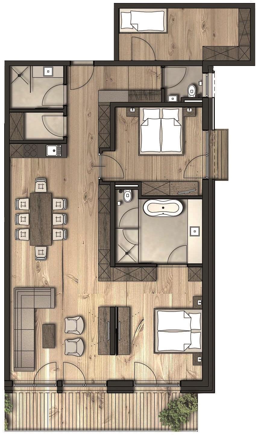 Apartment 4 für 6 Personen, ca. 103 m², mit 1 Doppelzimmer, 1 Doppelbett im Wohnbereich (durch Schiebetüren vom Wohnzimmer getrennt), 1 seperates Zimmer mit Stockbetten, 1 Bad mit WC, 1 Bad mit separatem WC, Kochnische & Küchenaussstattung, gemütlichem Wohnbereich mit Esstisch, Balkon.