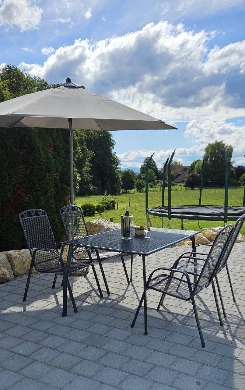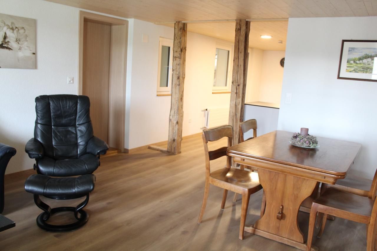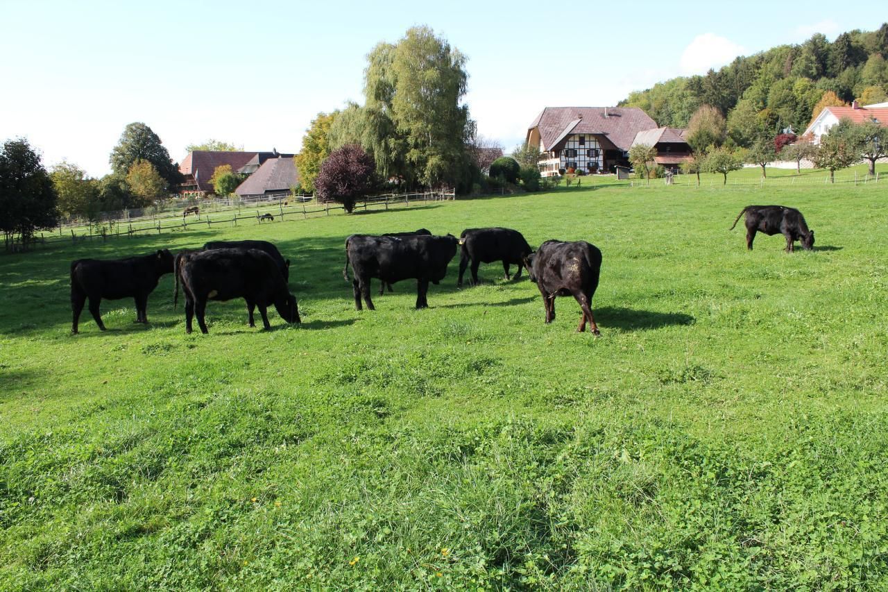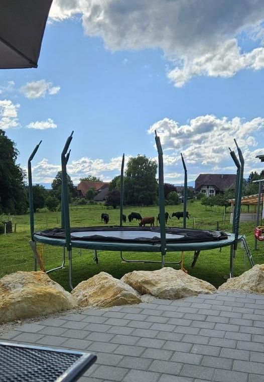 Küche mit Abwaschmaschine, Mikrowelle, Kühlschrank mit separaten Gefrierfächern, Backofen und Kochherd, Wohnzimmer mit Esstisch, Couch und TV. Badezimmer mit begehbarer Dusche und WC. WLAN steht gratis zur Verfügung. Der zur Wohnung gehörende Sitzplatz wurde im Frühling 2024 neu erstellt und befindet sich unmittelbar beim Kinderspielplatz. Für die Kinder gibt es ein Trampolin, eine Rutschbahn und mehrere Kinderschaukeln. Unseren neuen Pool dürfen Sie natürlich auch gerne mitbenutzen. Vom Sitzplatz aus geniessen Sie einen wunderschönen Blick Richtung Jura und können unseren Angus-Rindern beim Weiden zusehen.