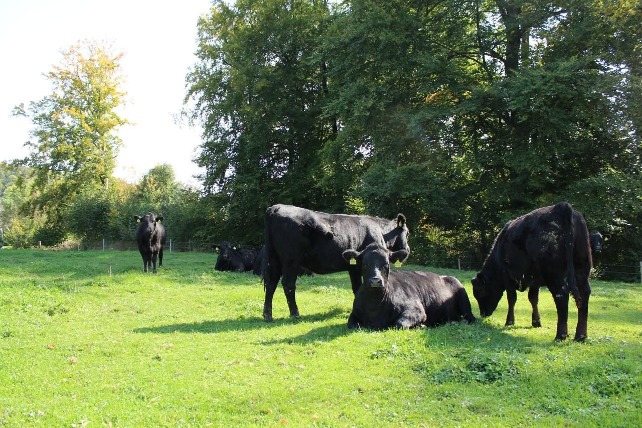 Auf unserem Hof halten wir Angus-Rinder und Schweine. Unser Kater Leo nimmt gerne Streicheleinheiten entgegen.