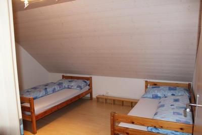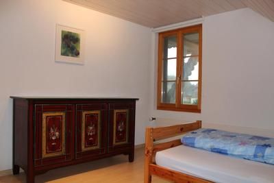 Grosses Schlafzimmer mit 1 Doppelbett, 1 Kleinkinderbett (für Kinder bis ca. 2 Jahren geeignet) und einem Zusatzbett nur für Kinder bis ca. 12 Jahren (+ Fr. 10.00 pro Nacht), Kinderzimmer mit zwei Einzelbetten.