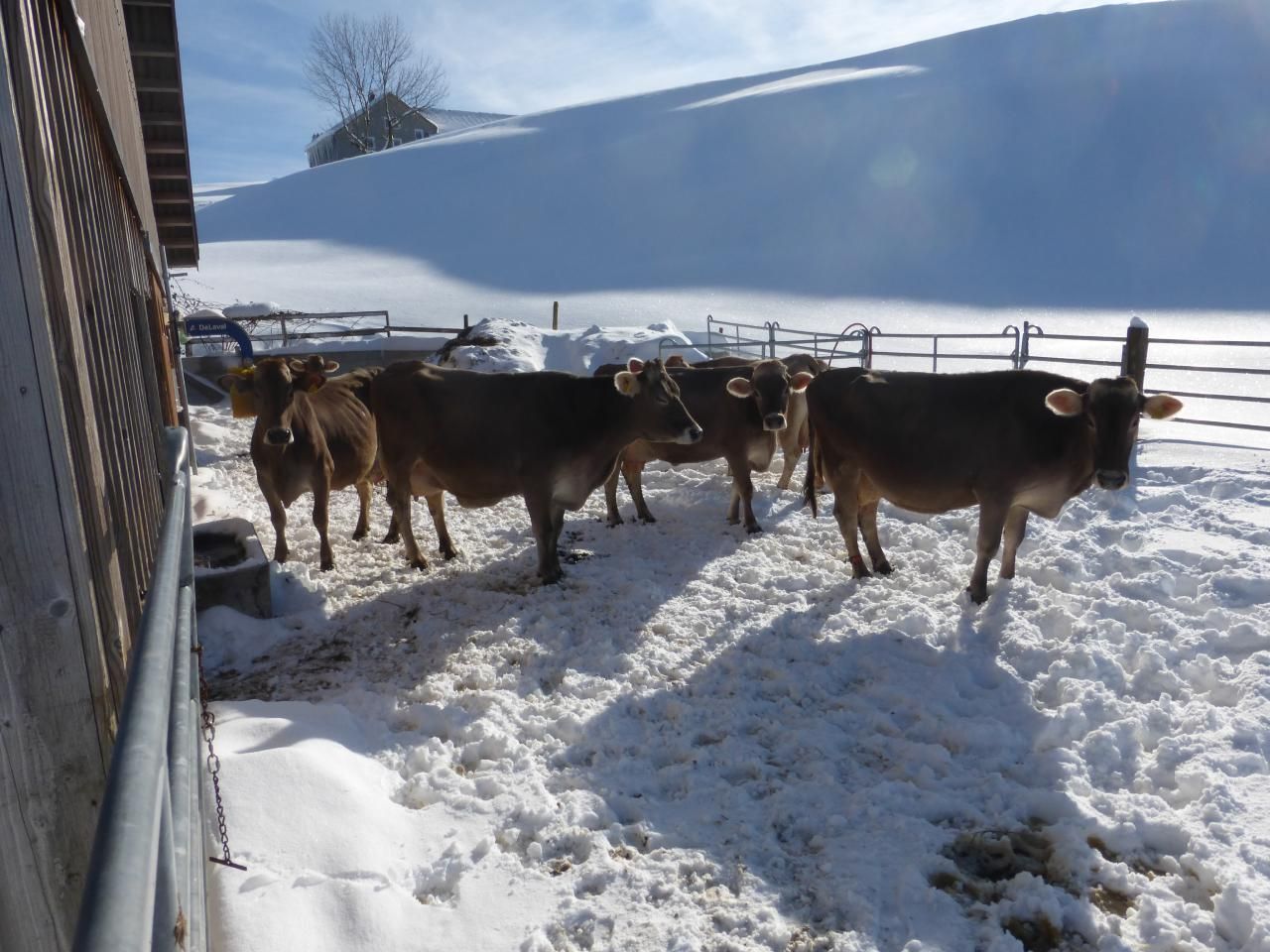 Die Milchkühe und Rinder befinden sich im Sommer auf der Alp (ca 2km entfernt) und werden dort gemolken.