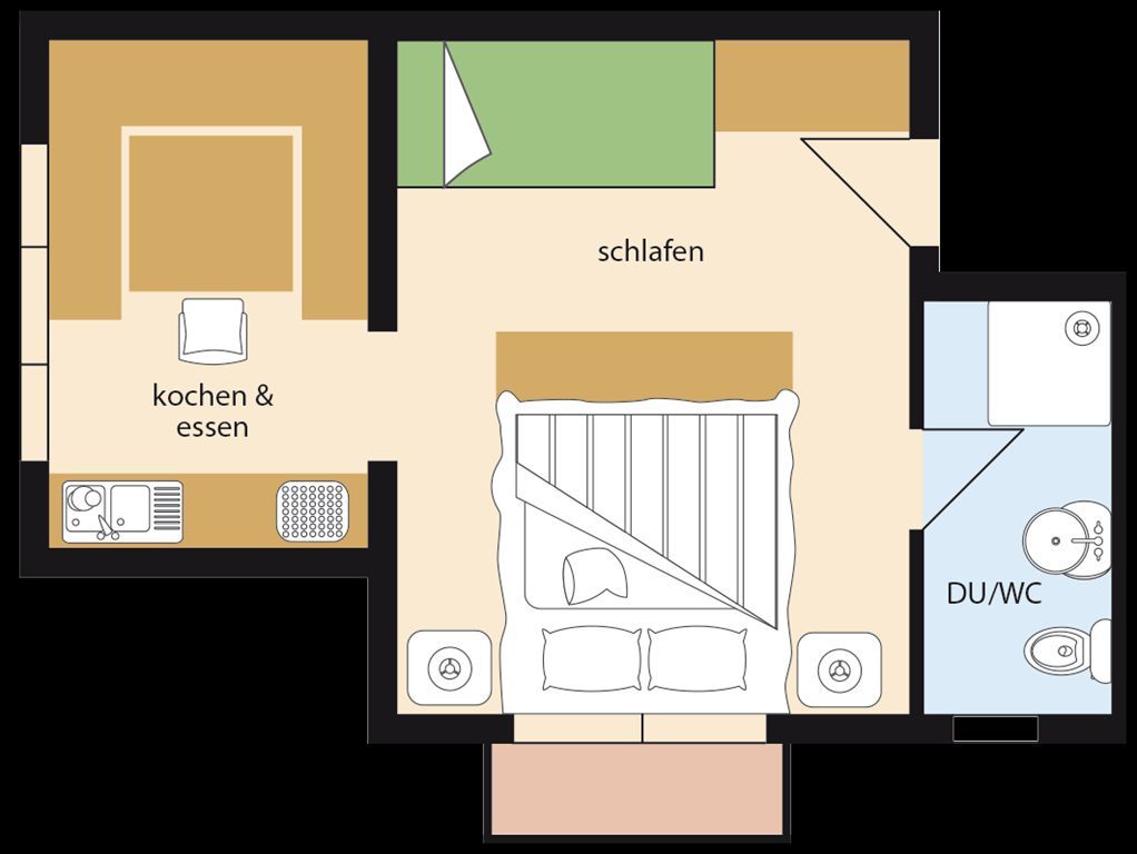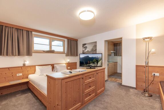 Appartement im Untergeschoß mit ca. 27 m²: Oberlichtfenster gehen ebenerdig nach draußen, nur etwas höher gesetzt - kein Balkon oder Terasse. Helle freundliche Wohnung, ausgestattet mit einem Doppel- od. Dreibettzimmer mit Kabel-Flat-TV, Safe, Dusche/WC, Haarföhn, Küche mit Sitzecke, Spülmaschine, Mikrowelle, W-Lan uvm.