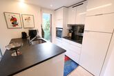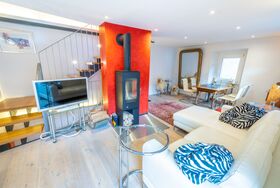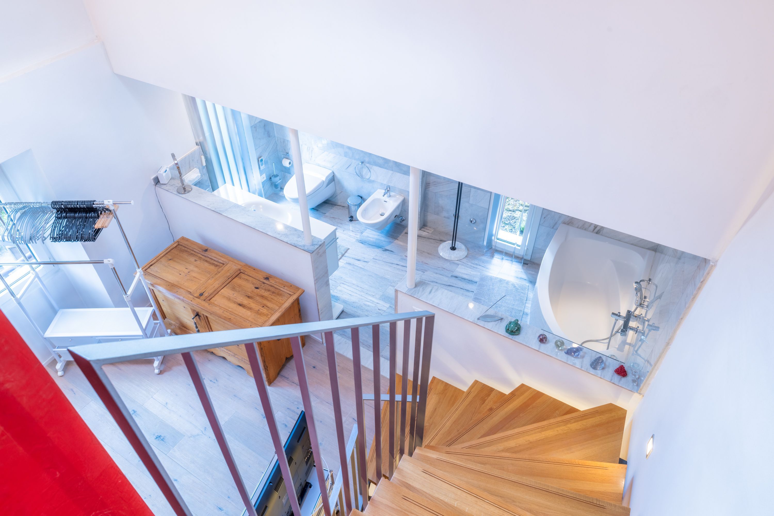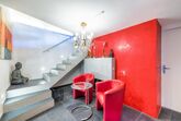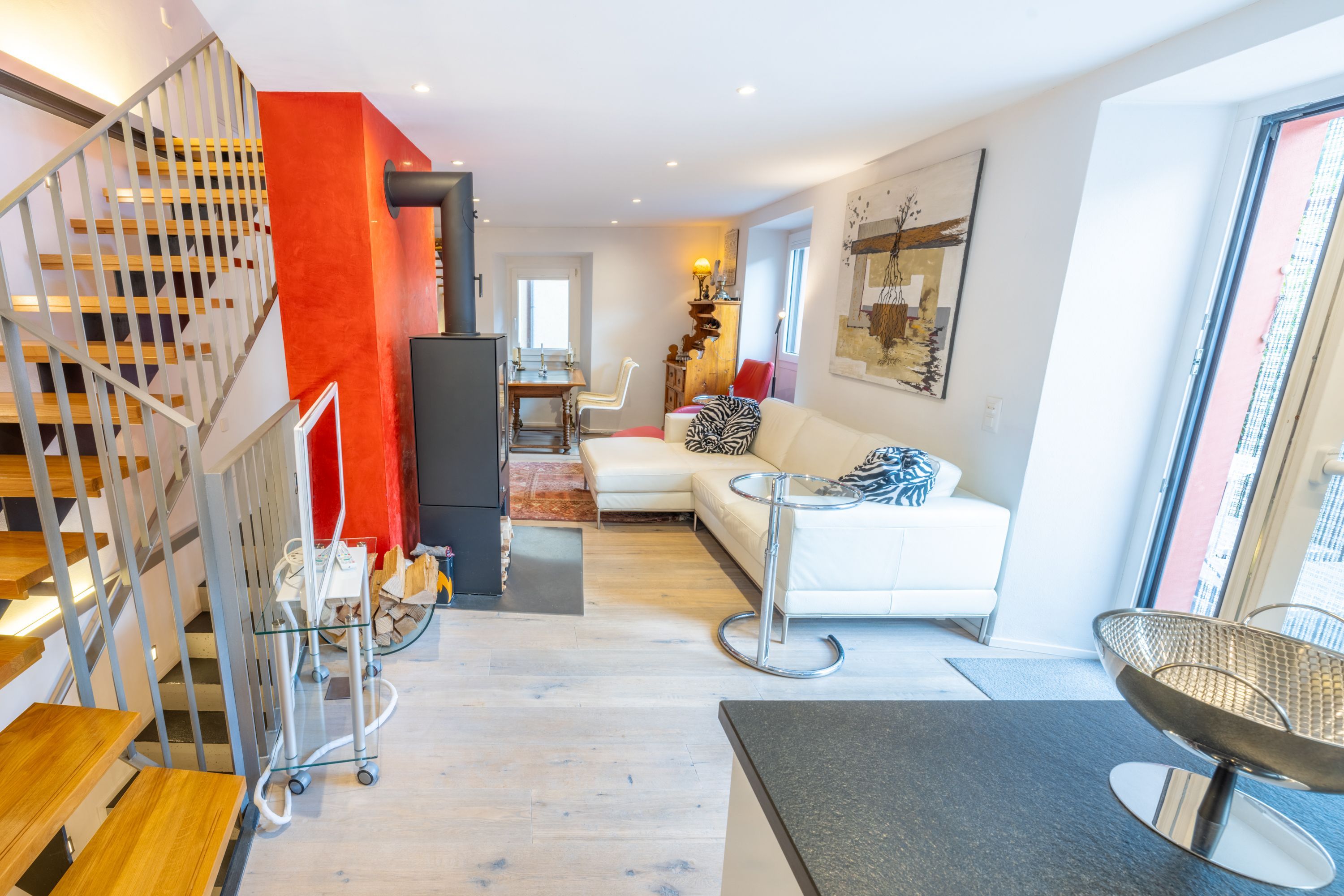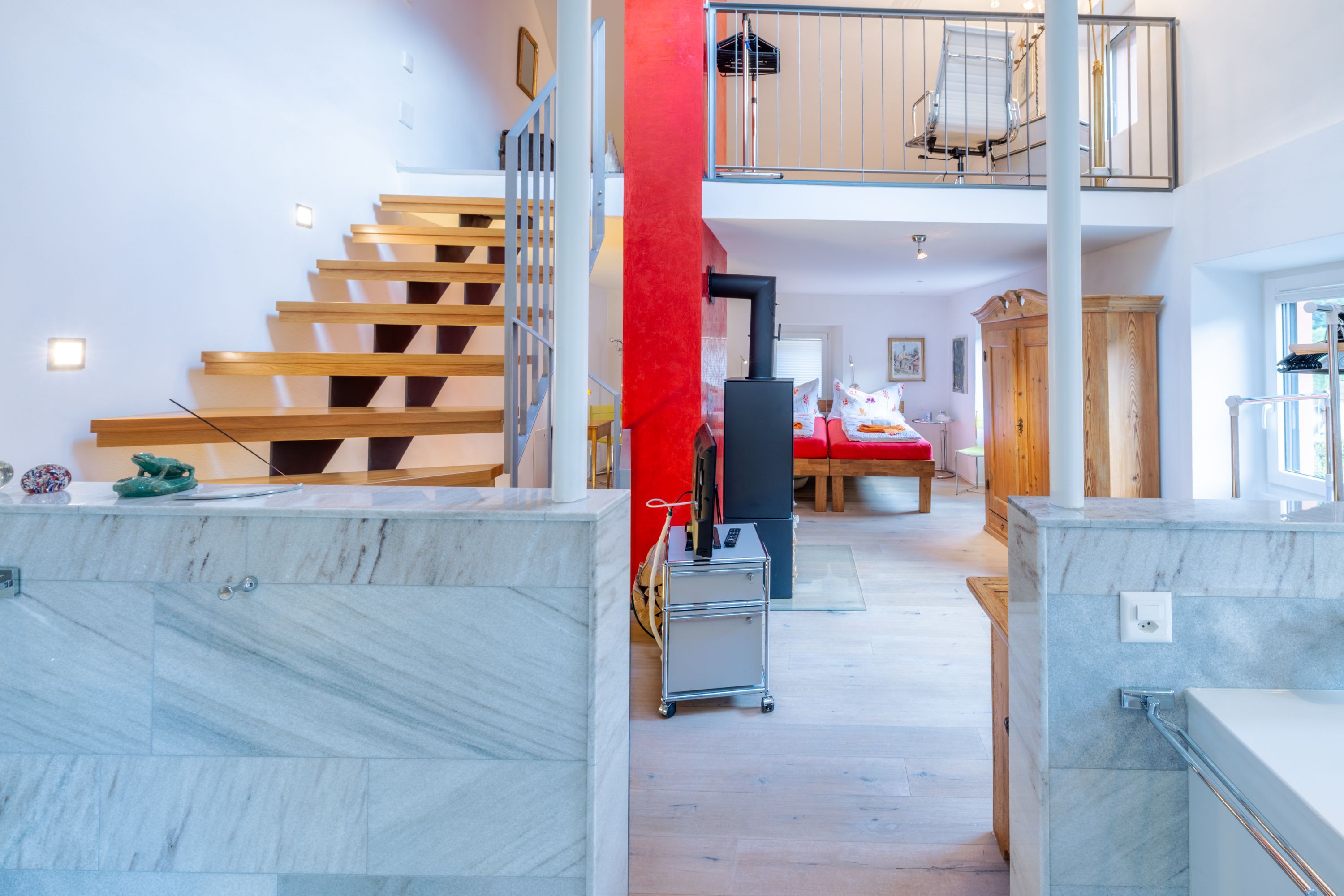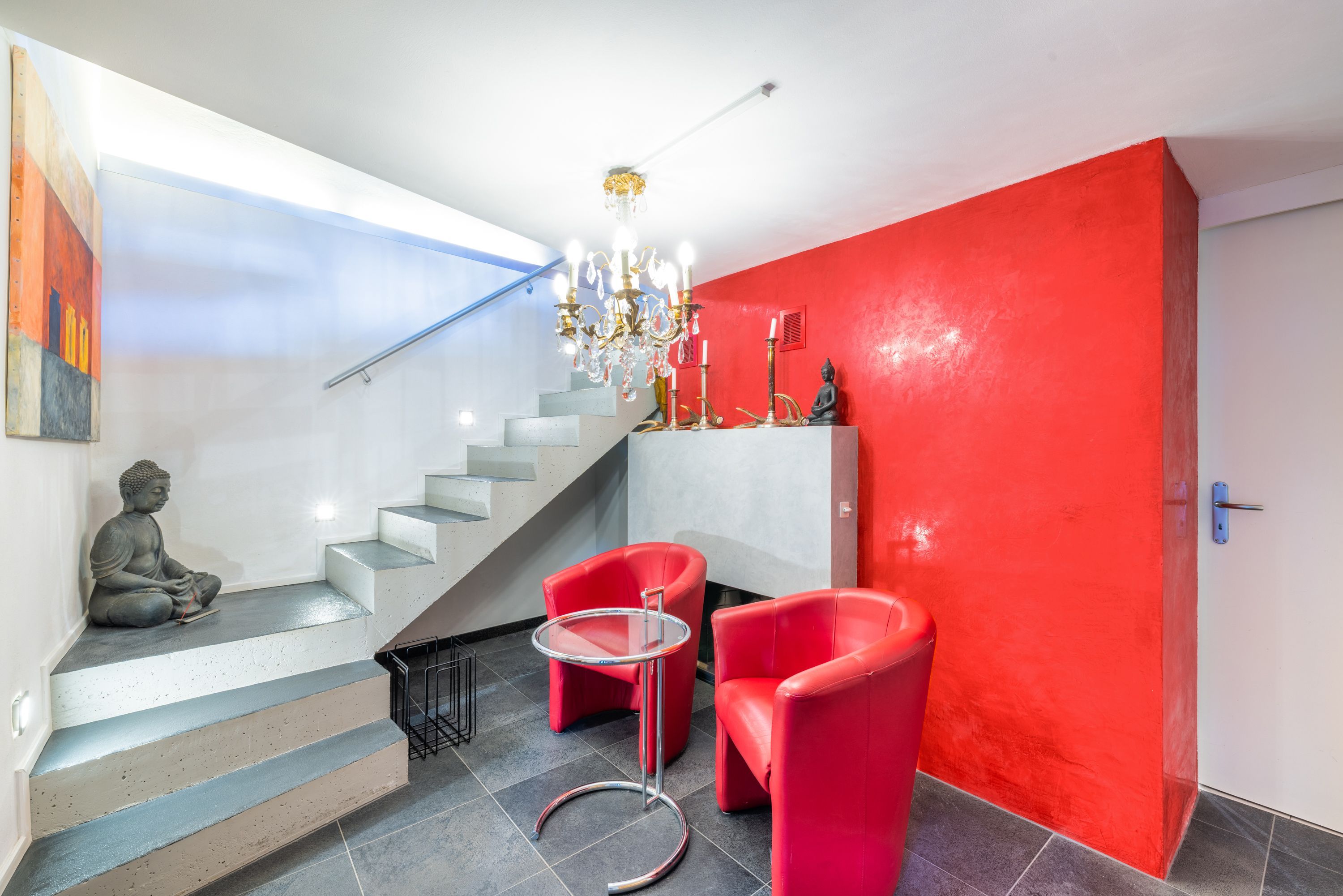 Innen überzeugt das Haus mit einem einzigartigen, mehrstöckigen Wohnbereich, der durch seine offene Gestaltung ohne Türen - mit Ausnahme des Technikraums und einer nicht abschließbaren Glas-Schiebetür zur Nasszelle - besticht. Die Innenausstattung umfasst - neben zwei eleganten Marmorbädern, einladende Eichenparkettböden im Wohnbereich und einer charakteristischen roten Stuckaturverkleidung der Kamine - auch moderne Annehmlichkeiten wie eine Wärmepumpenheizung mit Solarzellen und Bodenheizung. Die vollausgestattete Küche mit weißem Mobiliar, Glaskeramikherd und ausreichend Geschirr und Besteck - da sie regelmäßig von der Eigentümerin selbst genutzt wird - rundet das hochwertige Interieur ab.