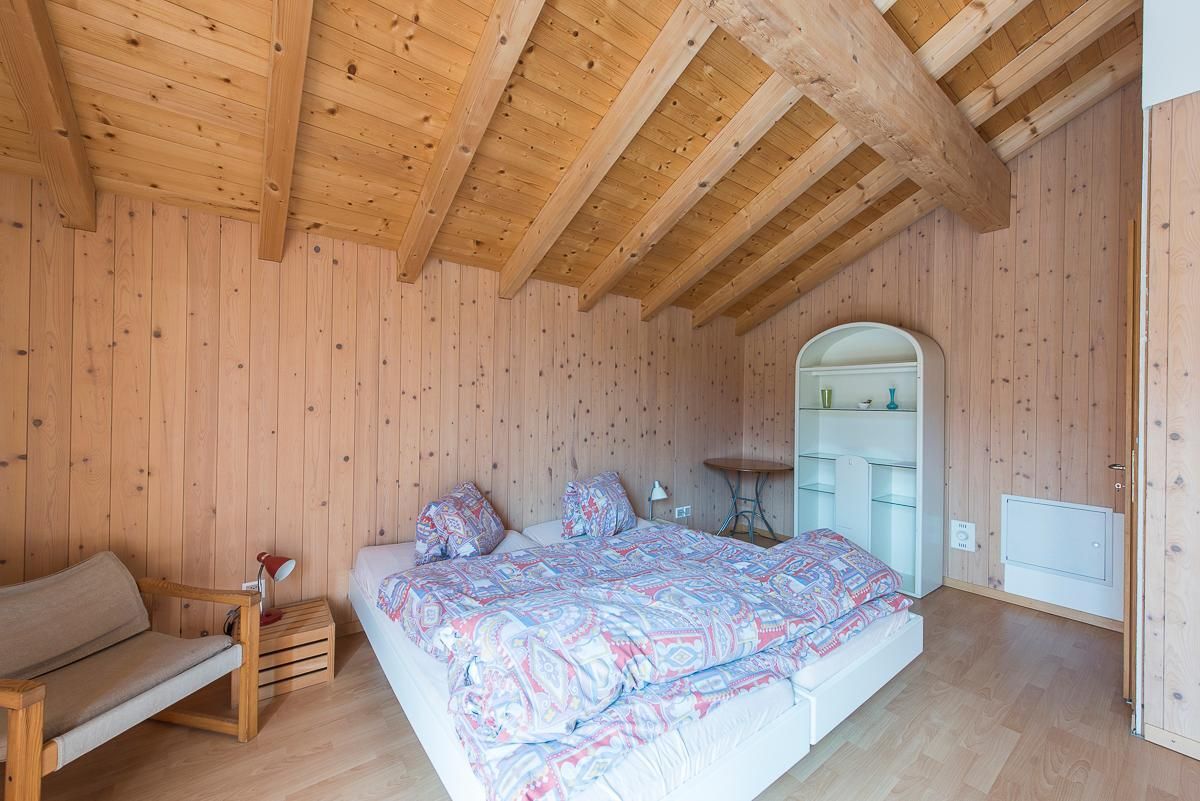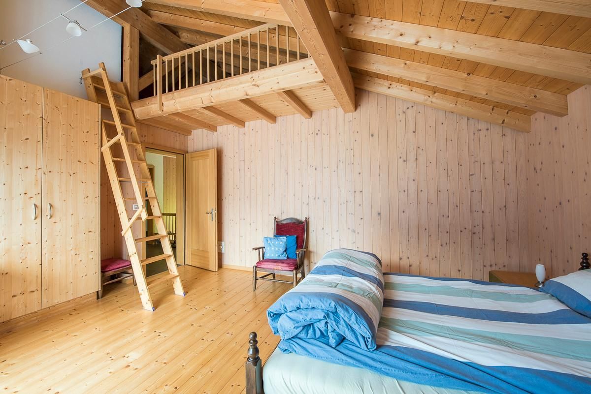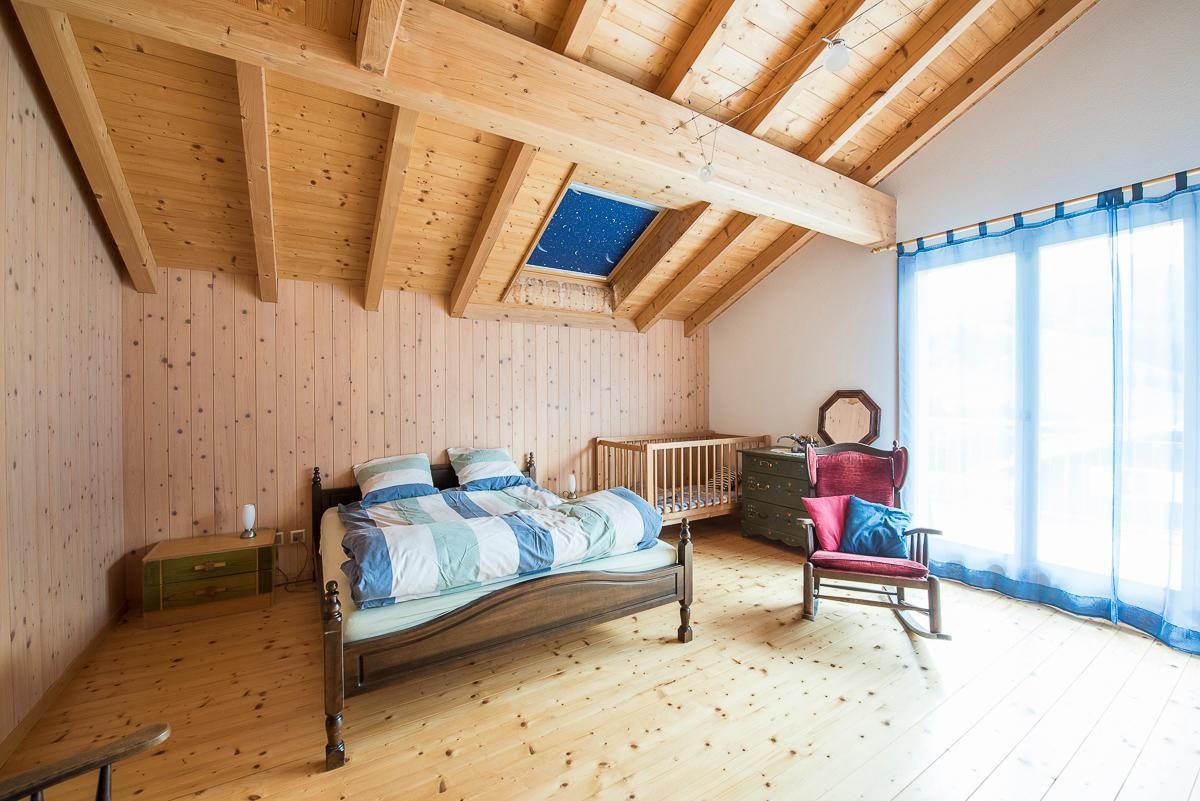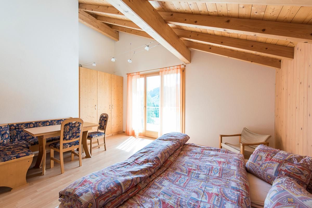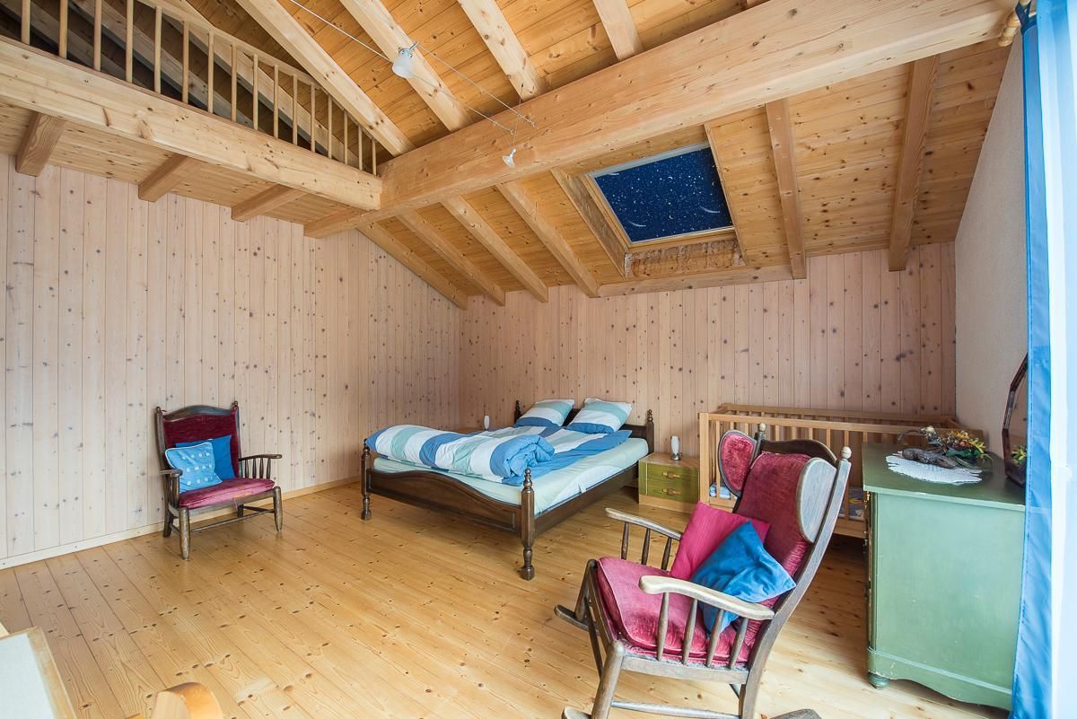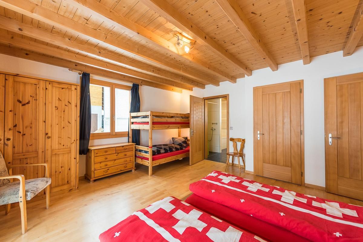 Auf Wunsch kann entweder ein separates Doppelzimmer für 2 Personen oder ein grosses Zimmer für bis zu 6 Personen dazu gemietet werden mit Doppelbett, Kinderbett und Galerie (4 Matratzen). Beide Zimmer befinden sich im OG und haben ein Etagen-WC mit Dusche, WC und Lavabo. Sofern beide Zimmer verfügbar sind, könnten zusammen mit der Wohnung Stöckli total 12 Personen beherbergt werden.