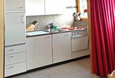 Offene Küche mit Herd, Backofen, Kühlschrank und Kaffeemaschine. Inneneinrichtung