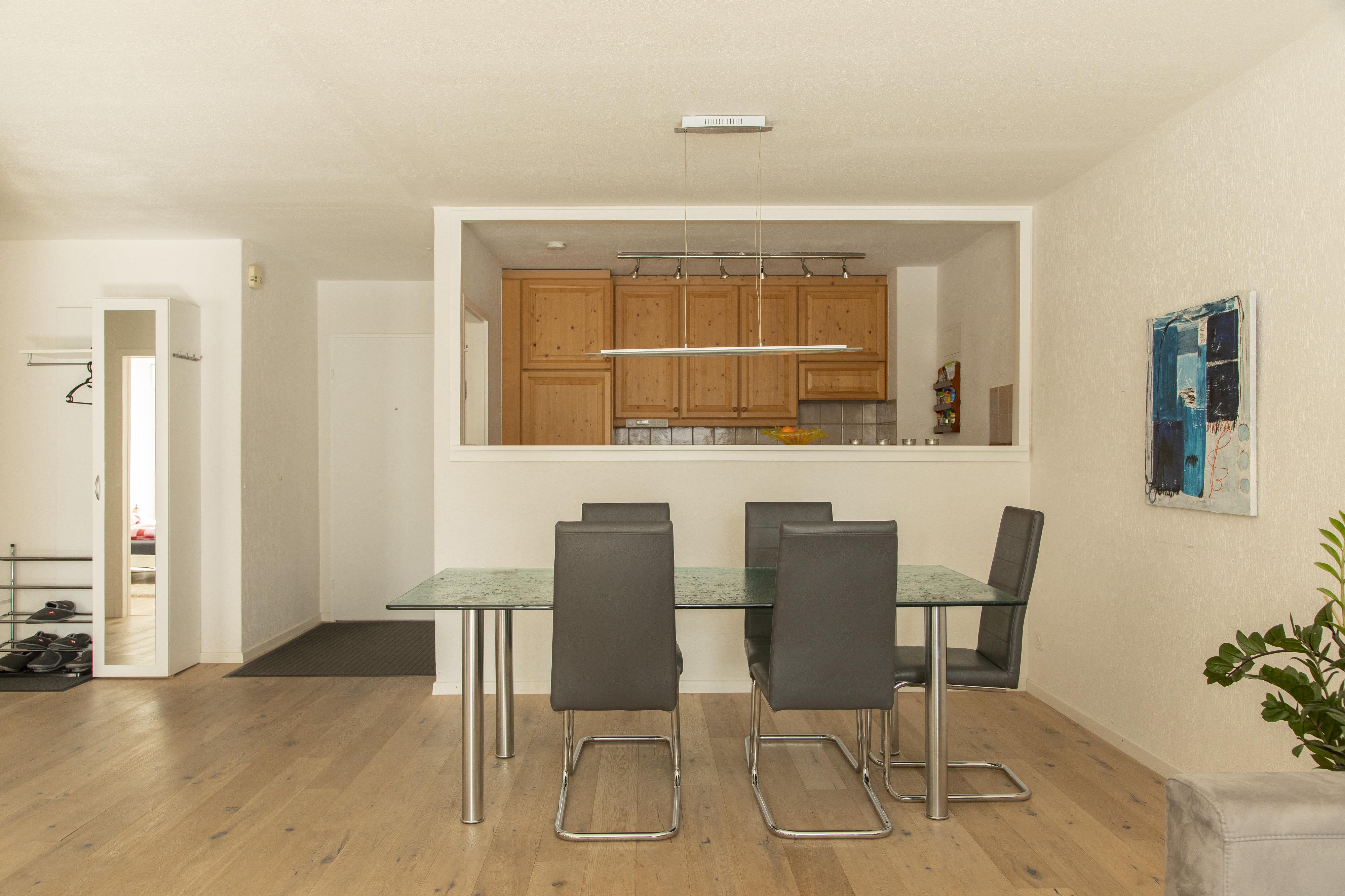 Sehr grosse 2 ½ Zimmerwohnung (ca. 75m2) im 2. Stock eines Mehrfamilienhaus mit Lift; grossem Südbalkon; Tiefgarage; eigener Skiraum; Abstellplatz für Fahrräder/Kinderwagen; Mitbenützung der Waschmaschine, Kinderspielplatz und das Hallenbad; Küche mit Backofen, Kühlschrank mit Tiefgefrierfach, Mikrowelle, Geschirrspülmaschine, Kaffemaschine; Dusche/WC, separates WC; Schlafzimmer mit 2 Einzelbetten; Wohnzimmer mit sehr komfortablem Bettsofa (160/200), Essecke, TV, Telefon, WLAN; Bettwäsche, Frottewäsche, Küchentücher; Haustiere sind nicht erlaubt; Nichtraucherwohnung!