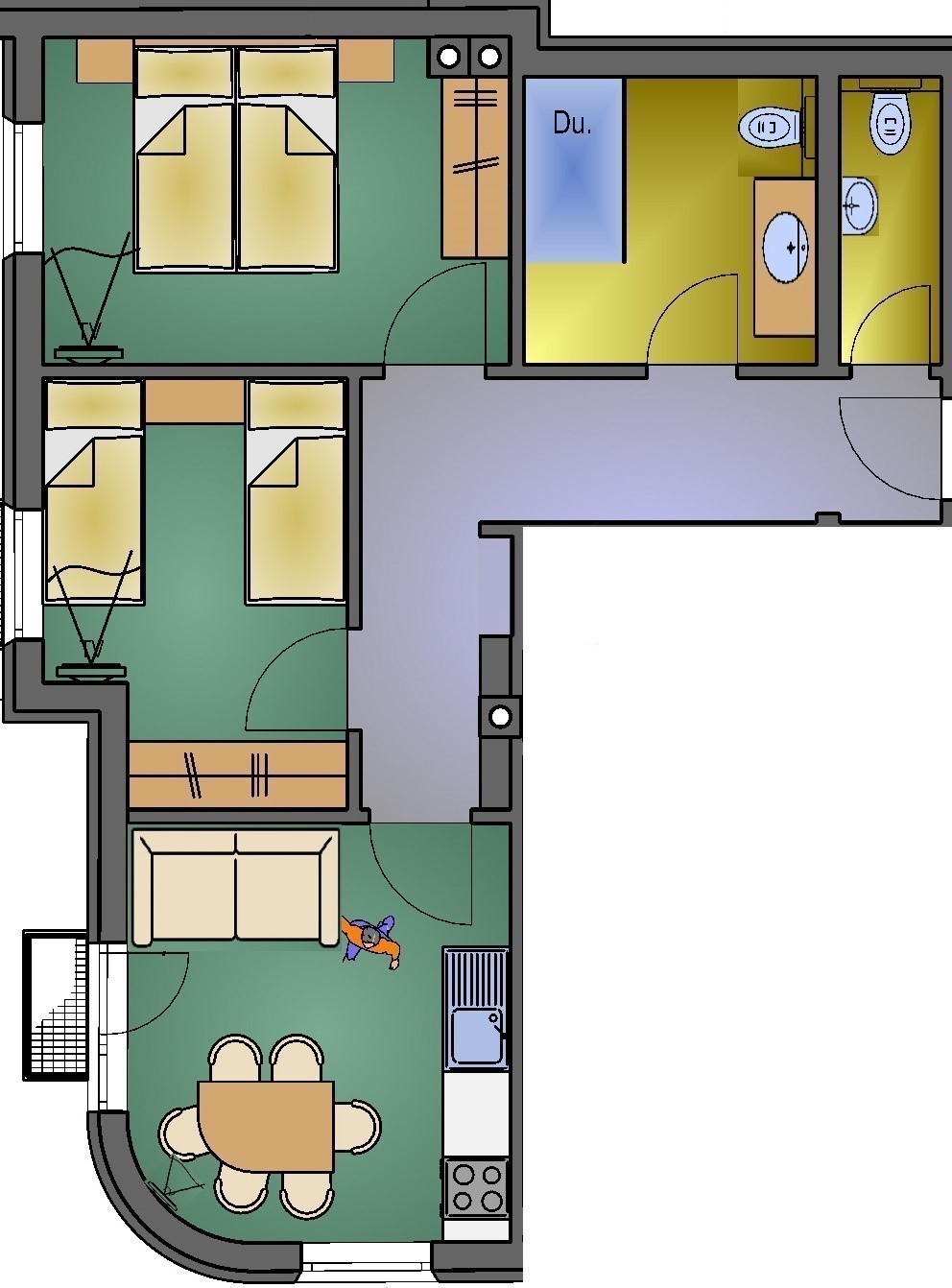 Die Wohnung befindet sich auf der Südwestseite. Grossartige Aussicht. 1 Wohnküche, 2 Schlafzimmer, 1 Terrasse. 2 X Dusche mit separaten WC. sowie Sat-TV, Radio, Telefon, Internetanschluss, WLAN, Kaffeemaschine, Toaster, Backofen, Mikrowelle, Kochgeschirr, Bett- und Küchenwäsche, Bade- und Handtücher, Haarfön usw.
