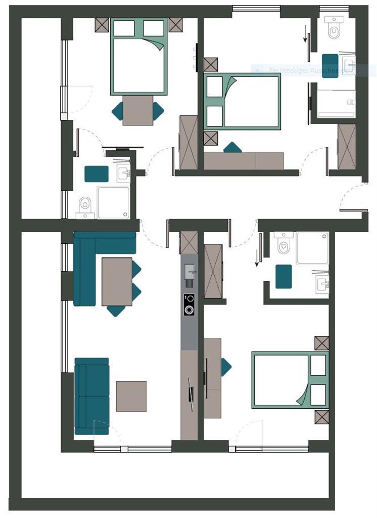 Komplett neu errichtetes Appartement mit 3 Doppelzimmer (1x auch mit getrennte Betten möglich) mit jeweils Badezimmer mit Dusche/WC und Haarföhn, Safe, Radio und Flat-TV. Vorraum, komplett ausgestattet Wohnküche mit Essbereich und großzügigem Wohnbereich mit Relax Sofa und Flat-TV. Balkon mit herrlicher Aussicht. Größe ca. 75 m².
