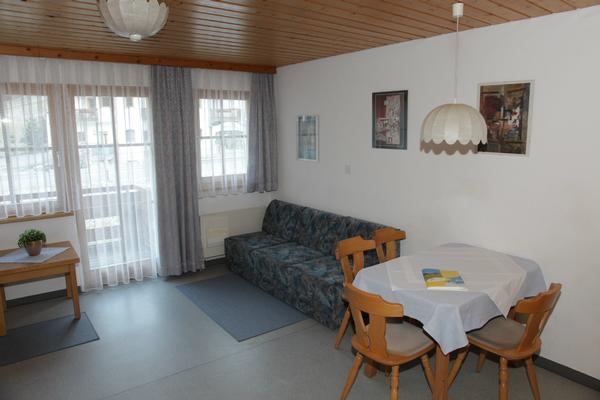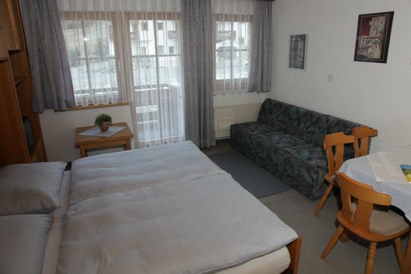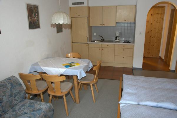 Geräumige, helle Einzimmerwohnung im 1. Stock, Balkon, Südseite, DU/WC, Haartrockner, Kochnische mit Zwei-Plattenherd, Kaffeemaschine/Nespressomaschine (Kapseln im Haus erhältlich), Schrankklappbetten, Schlafcouch für 3. Person, SAT-TV, Telefon, gratis Internet mittels Kabel, Nichtraucherwohnung.