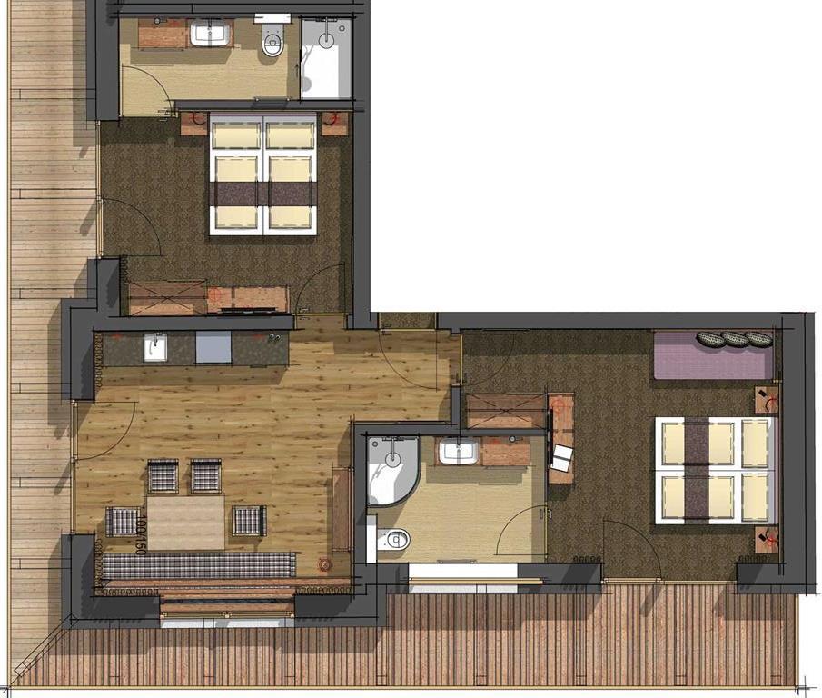 Hochwertig eingerichtetes Appartement im 1. Stock mit ca. 65 m², Vorraum mit Garderobe, 2 Doppelzimmer mit Boxspringbetten, einmal mit Sofa (Liegefläche 80x200), 2 Badezimmer mit WC und Regendusche, Föhn, Flat-TV in jedem Zimmer, Wohnküche mit Essecke und voll ausgestatteter Küchenzeile (Backrohr, Ceranfeld mit 4 Platten, Spülmaschine, Kühlschrank mit Gefrierfach, Wasserkocher, Geschirr), Safe.